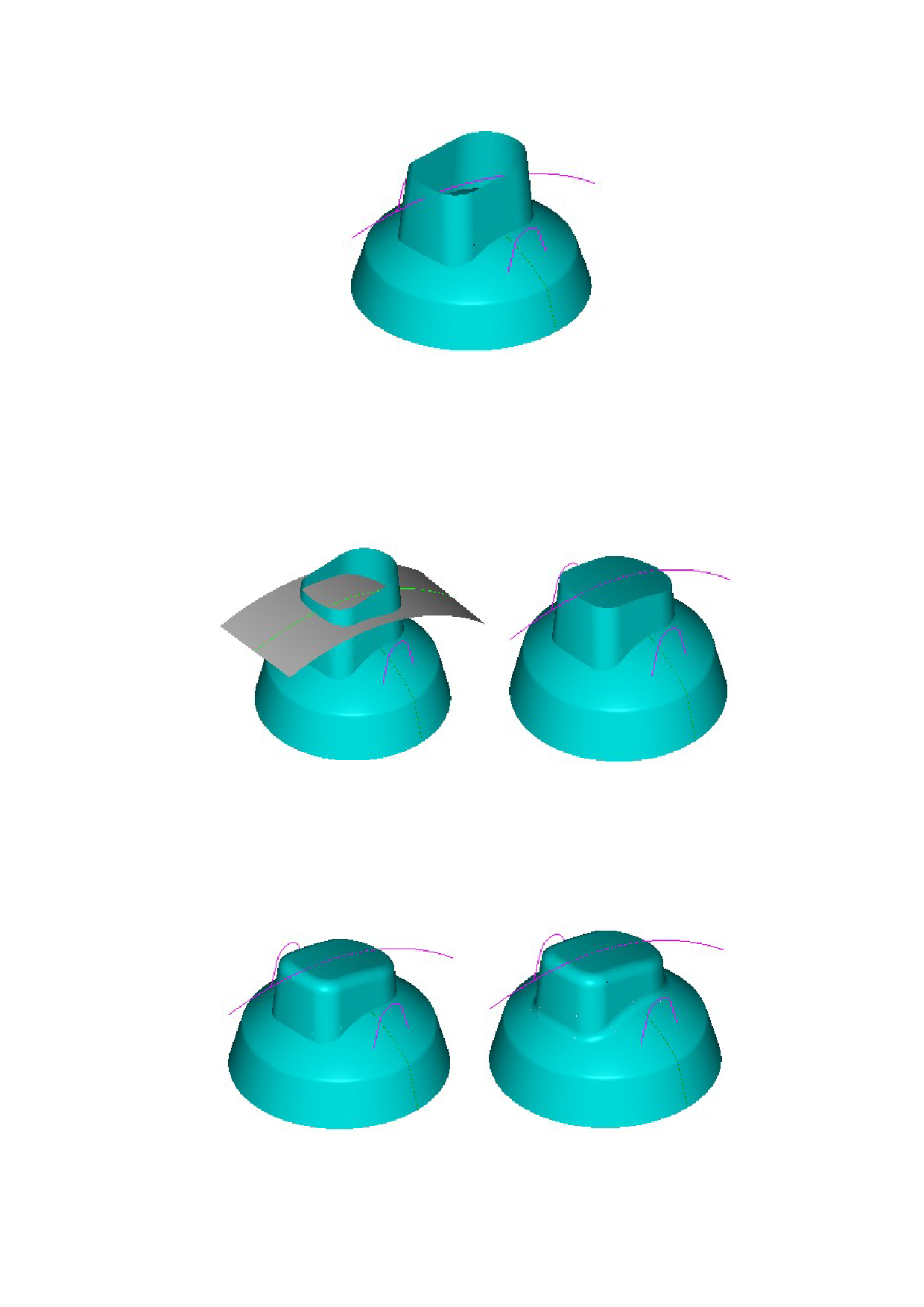 图 10-4-9 拉伸曲面构造模型上部凸台的顶面 图 10-4-10 顶面与模型上部凸台的侧面进行裁剪