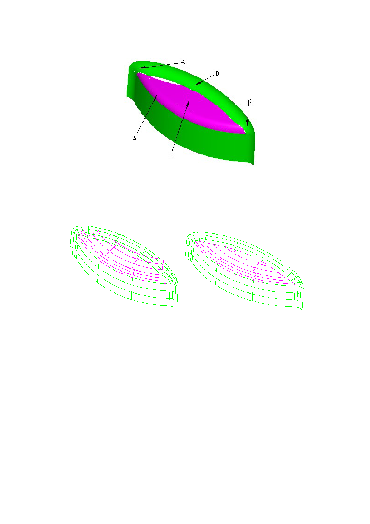 各自的原始曲面,然后采用面 C、D 和 E 的边界线对这两张原始面进行线面裁剪即可;如