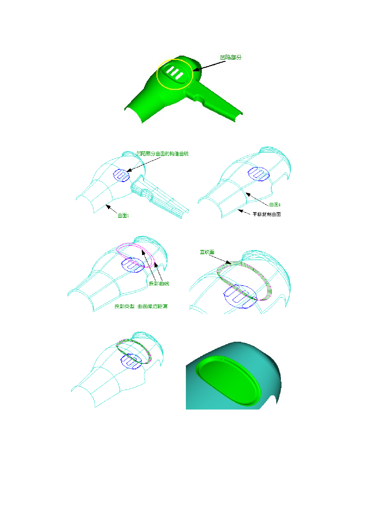 图 8-21 构造凹陷部分的曲线和曲面 图 8-22 将曲面 1 沿 Z 轴负向平移 2.0 生成曲面 2