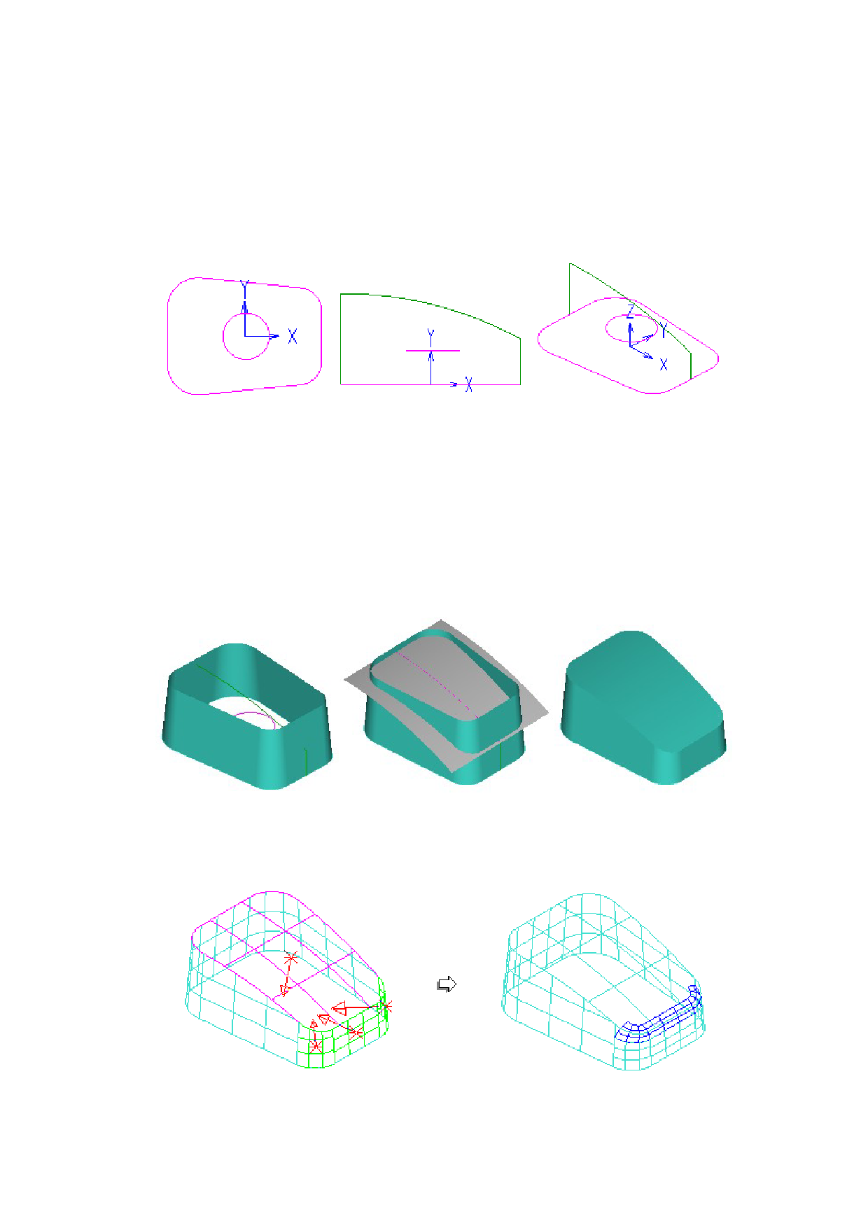 图 10-1-4 拉伸面形成模型侧面 图 10-1-5 拉伸面生成模型顶面 图 10-1-6 顶面与侧面进行面面裁剪