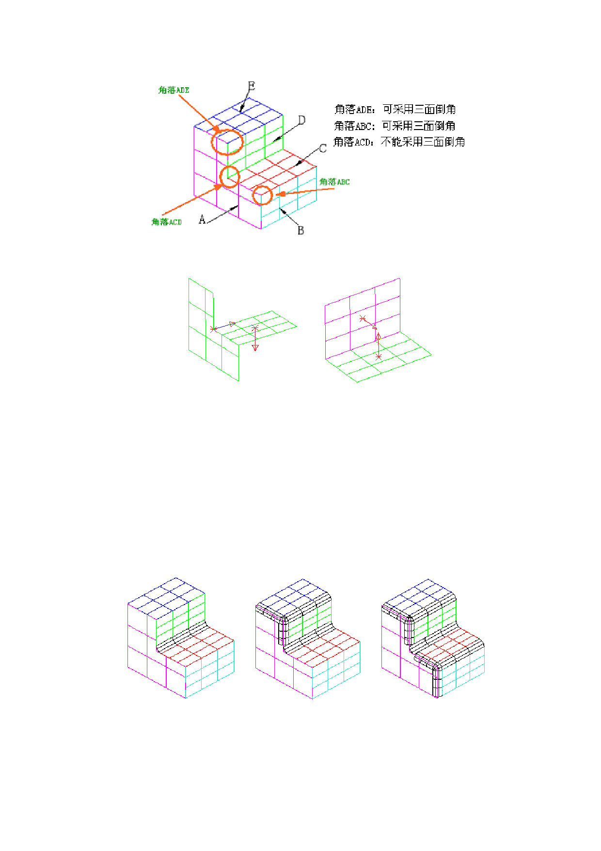 (a) 面 C 和面 D 两面倒角 (b) 角落 ADE 三面倒角(裁剪三曲面) (c) 角落 ABC 三面倒角(裁剪三曲