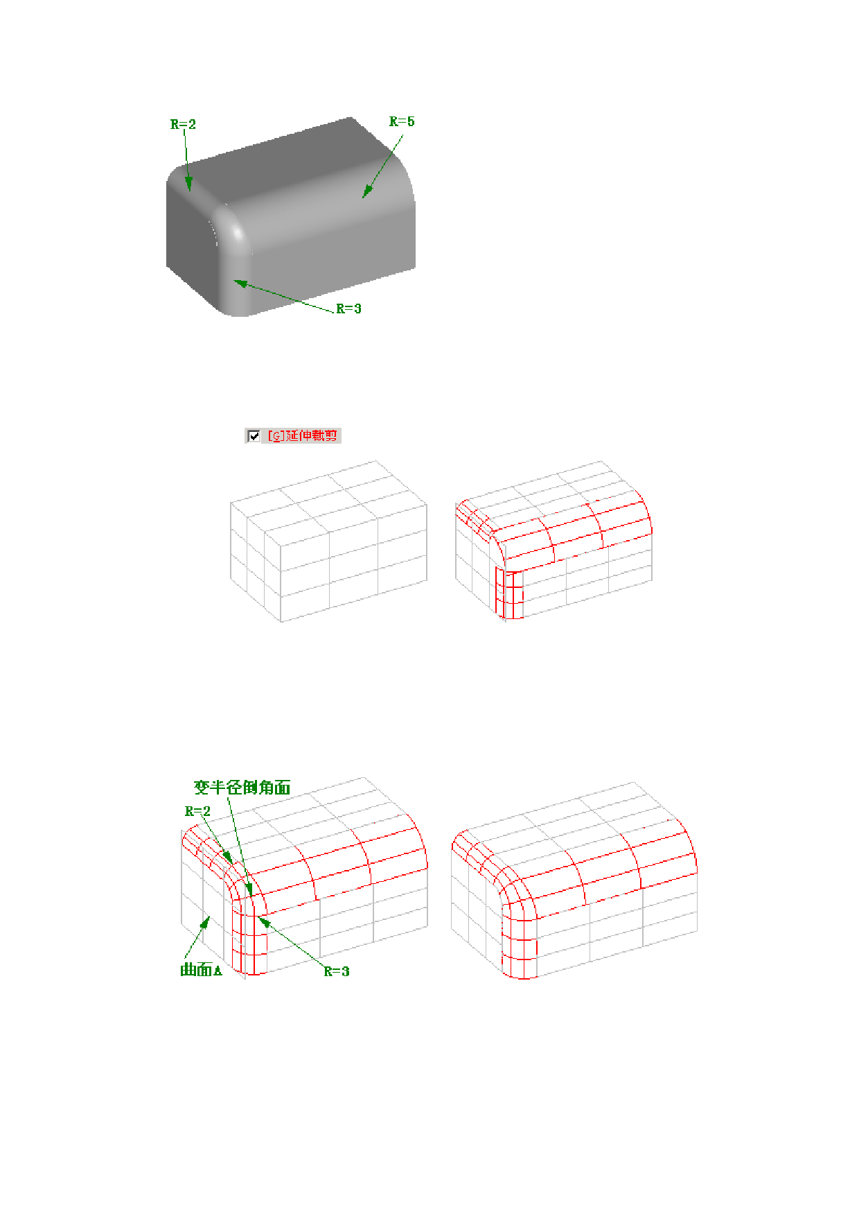 线面裁剪:用 R=2、R=3 和变半径倒角面这三张曲面在曲面 A 上的边界线