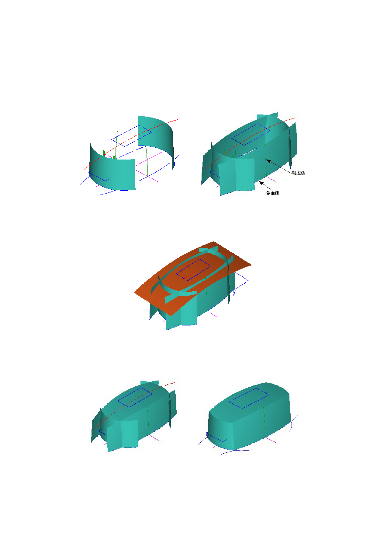 图 10-3-7 拉伸面建立模型前后两个侧面 图 10-3-8 单截面单轨扫掠面建立模型左右两个侧面