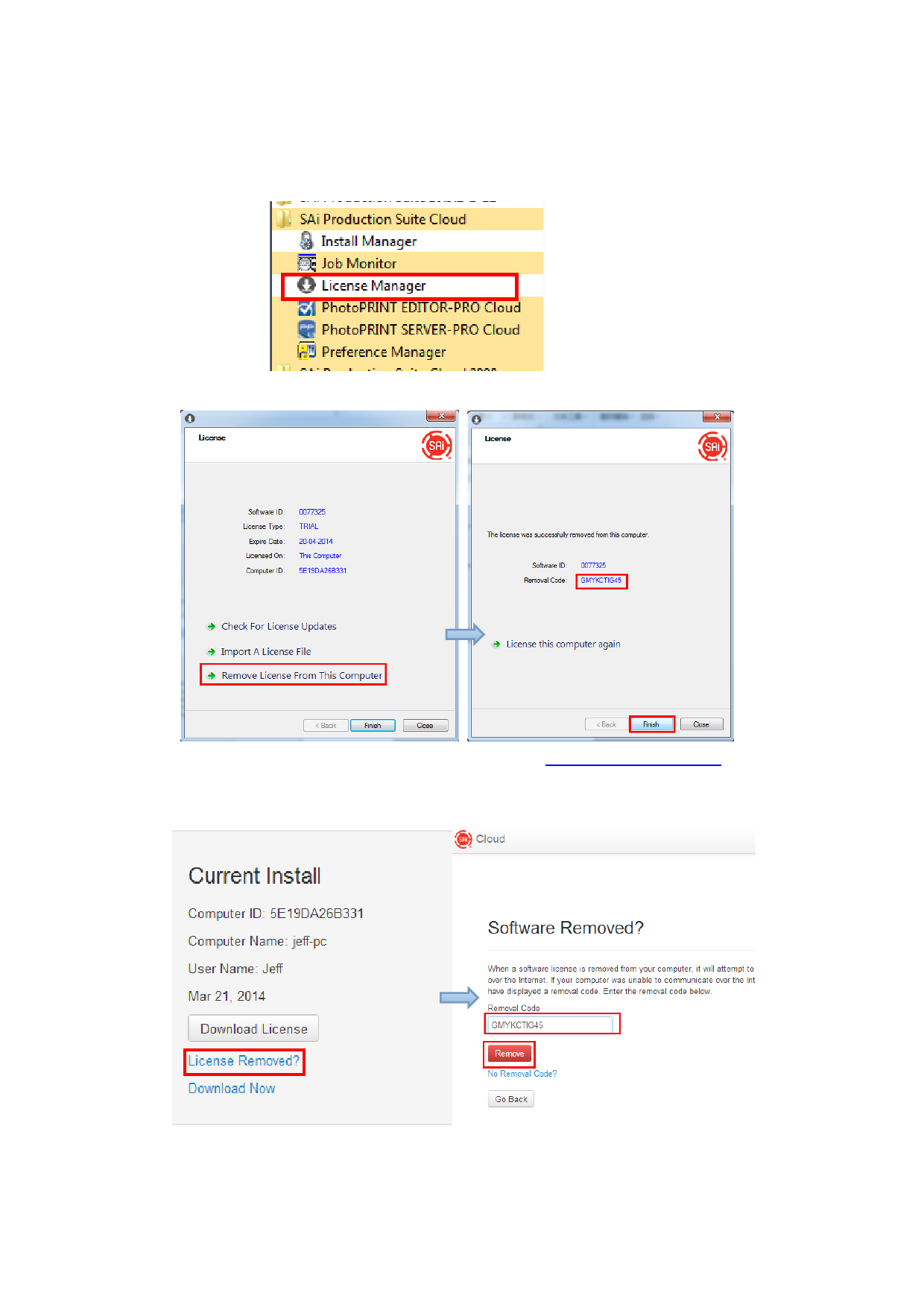 2. Click Remove License From This computer, then record removal code in license dialog box.