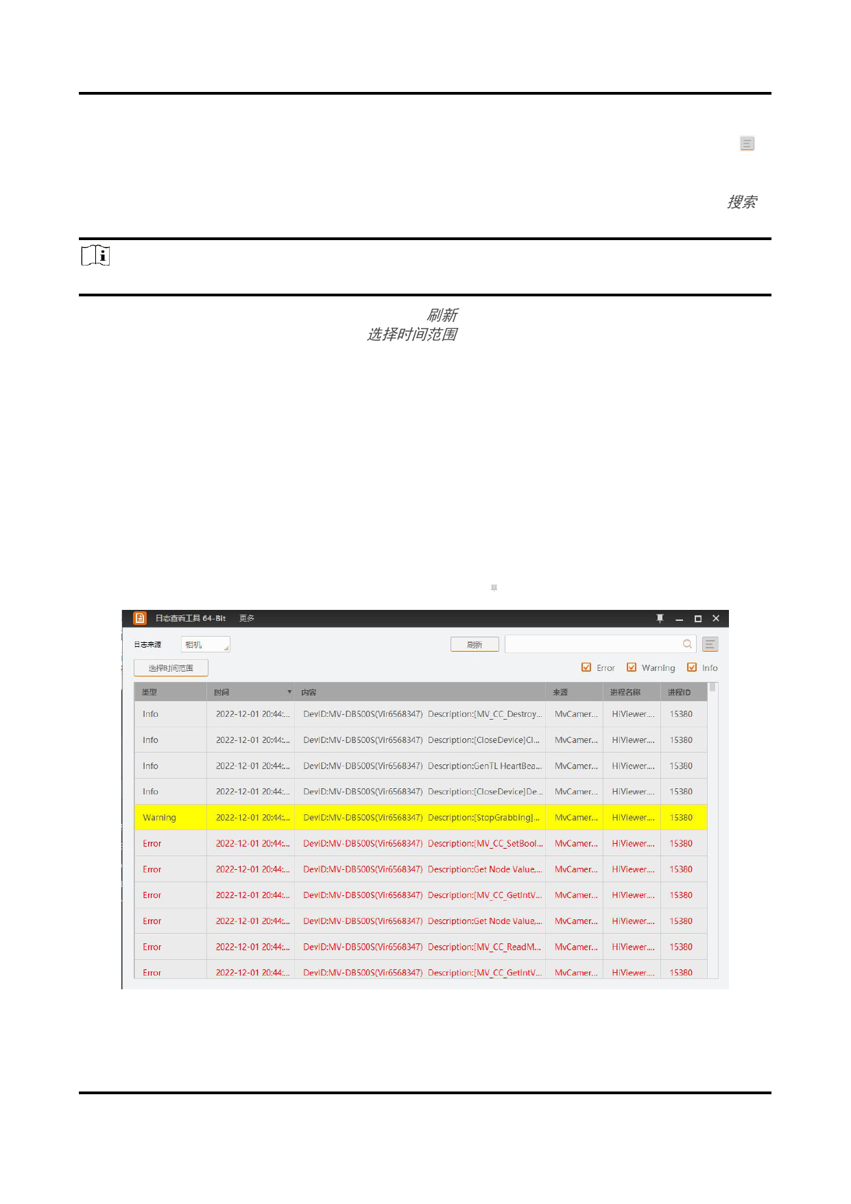 日志分为Error、Warning、Info三种类型,可通过左上角筛选类型部分是否勾选来决定日志查看工具中是