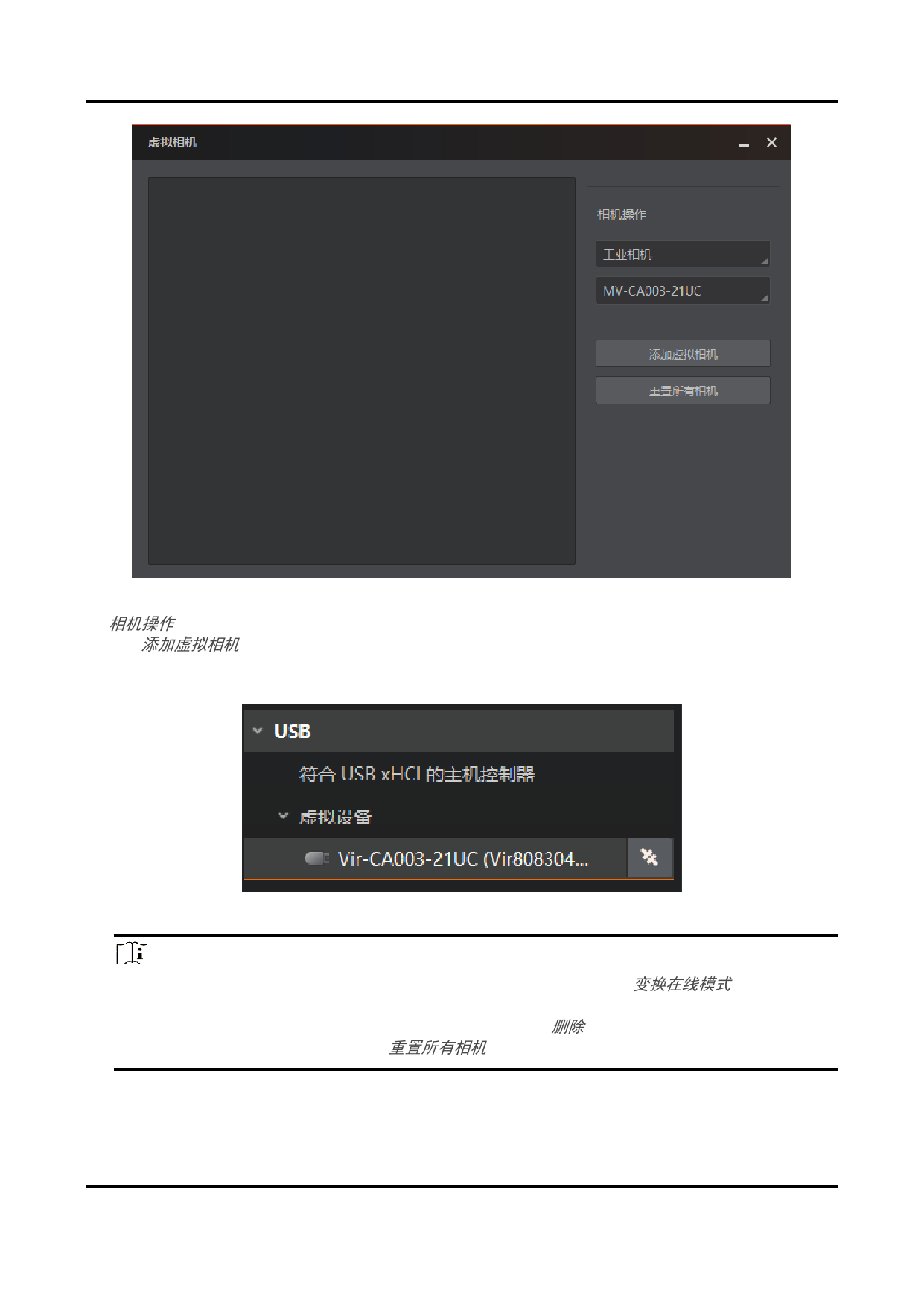 ● 若需要改变单个相机的连接状态,选择已添加的虚拟相机,右键点击变换在线模式可断开已连接