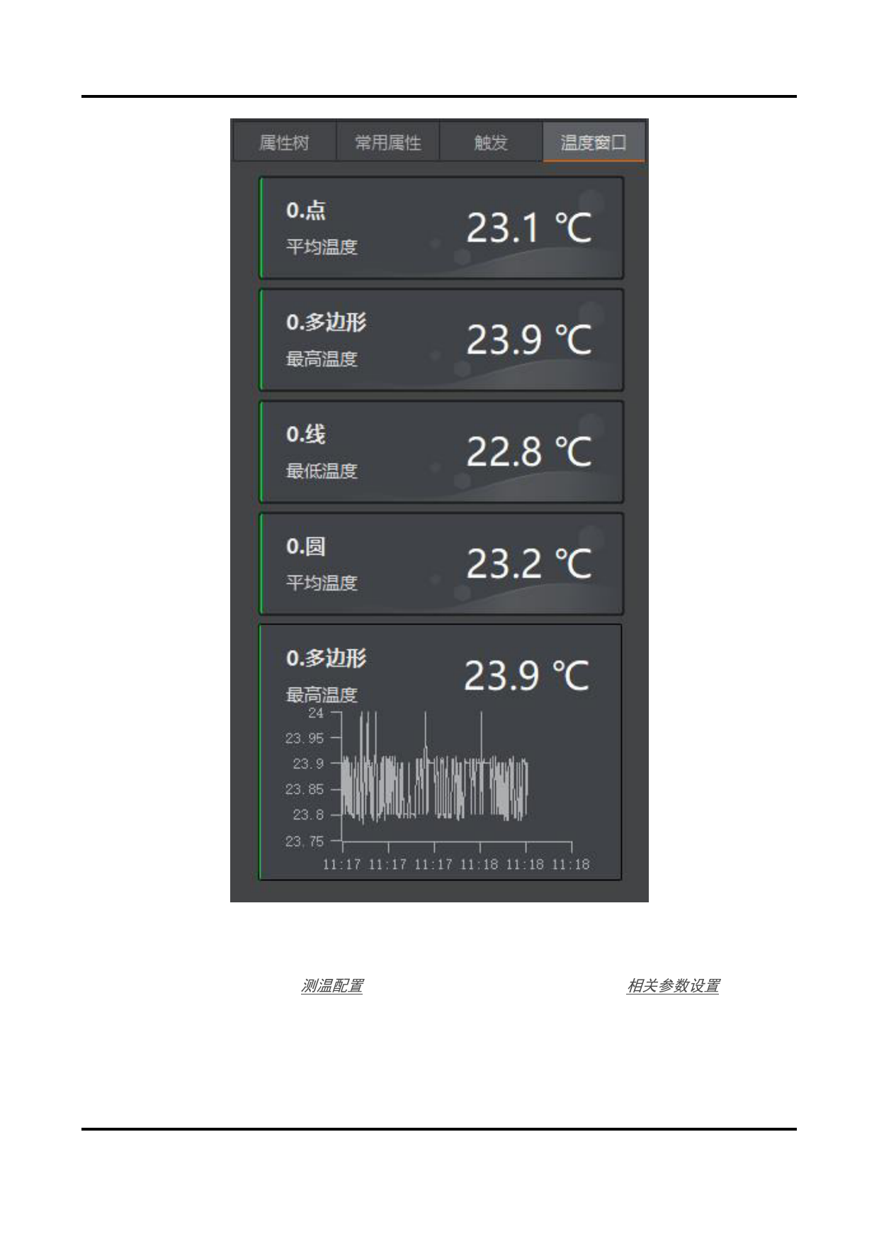 温度数值显示对应测温区域的名称和实时温度信息。