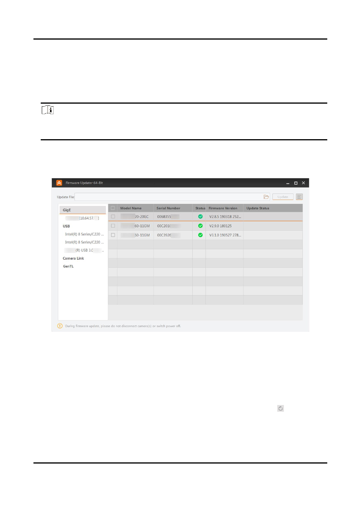 ● Cameras of different types of interfaces cannot be updated at the same time.