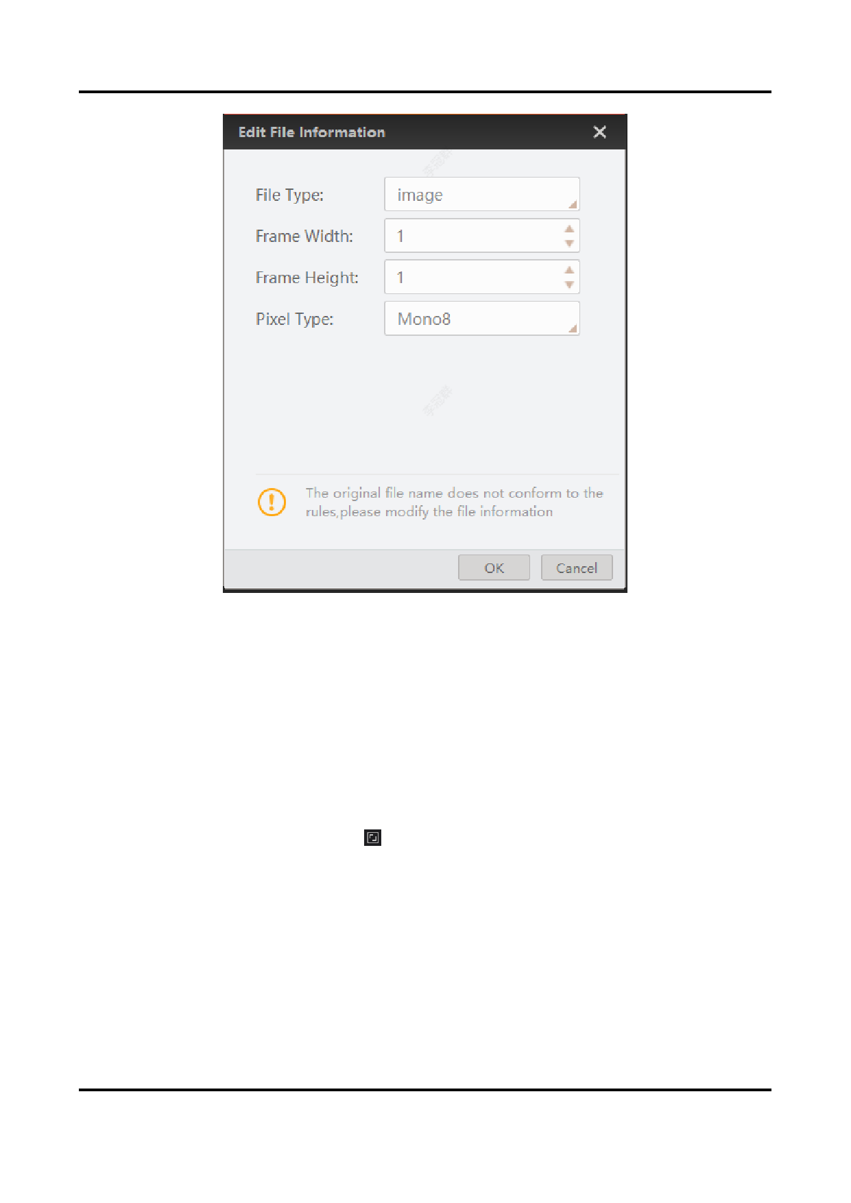 2. Edit the file information, including file type, frame width, frame height, and pixel type.