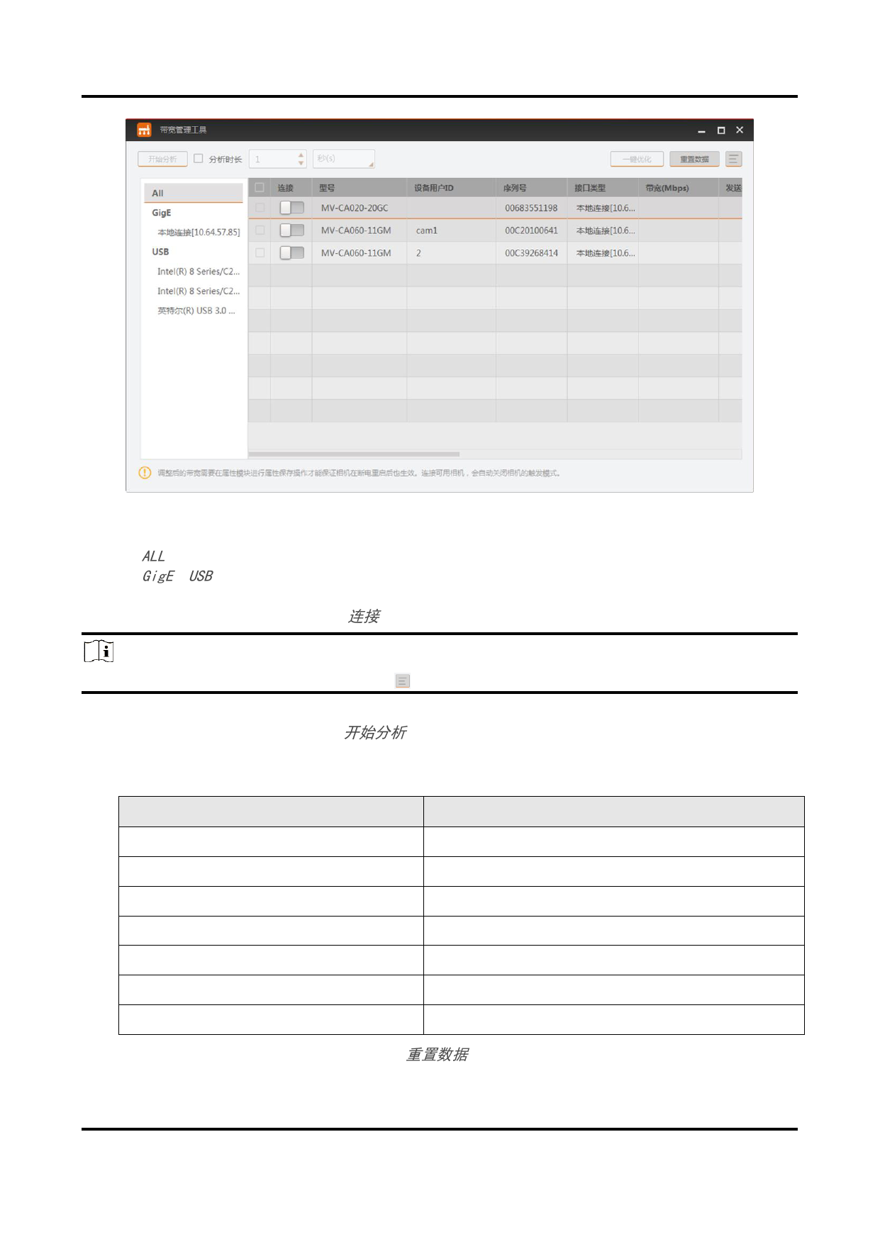 开始带宽分析和优化带宽前,需在右侧连接并勾选相机。
