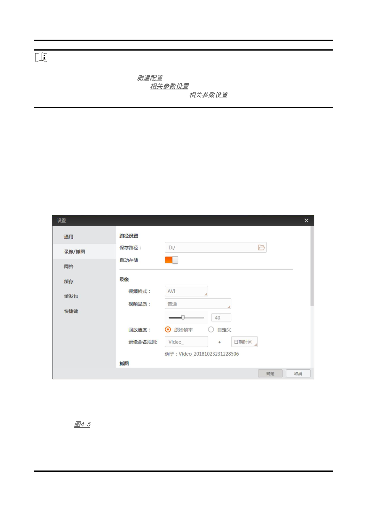● 若启用自动存储功能,则录像或者图像直接保存在设置的保存路径下。