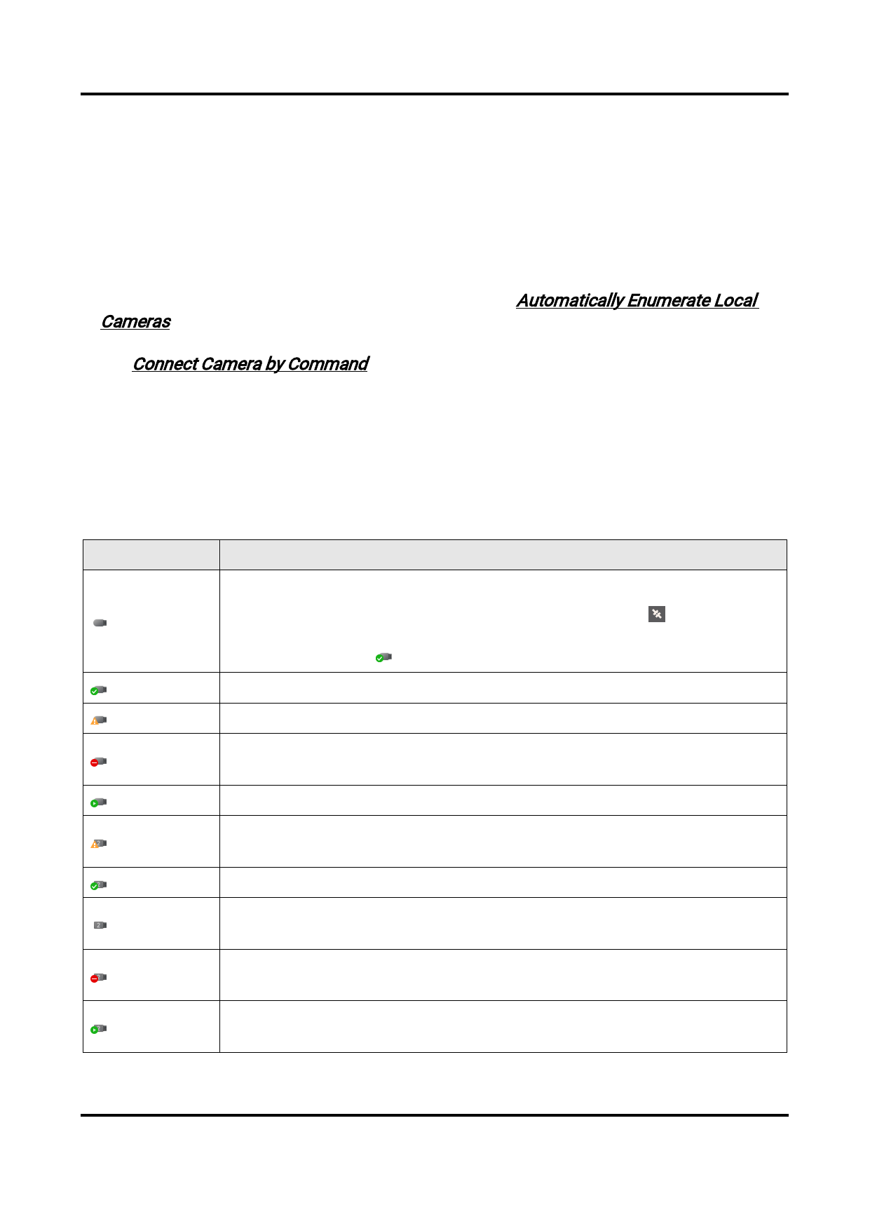 The Software provides multiple icons to indicate the status of the USB3 Vision camera.