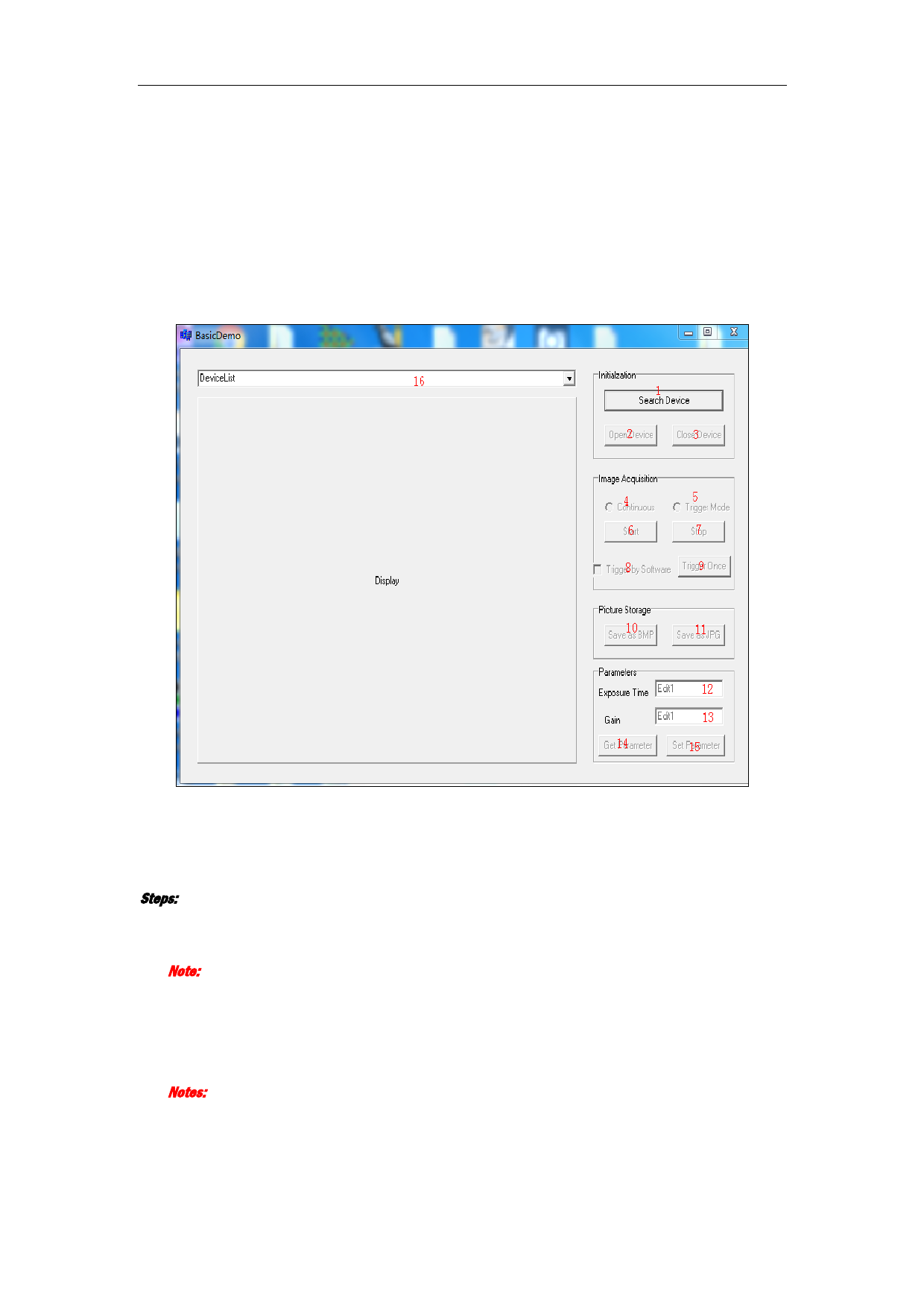 parameter control), one drop-down device list, one image displaying window.