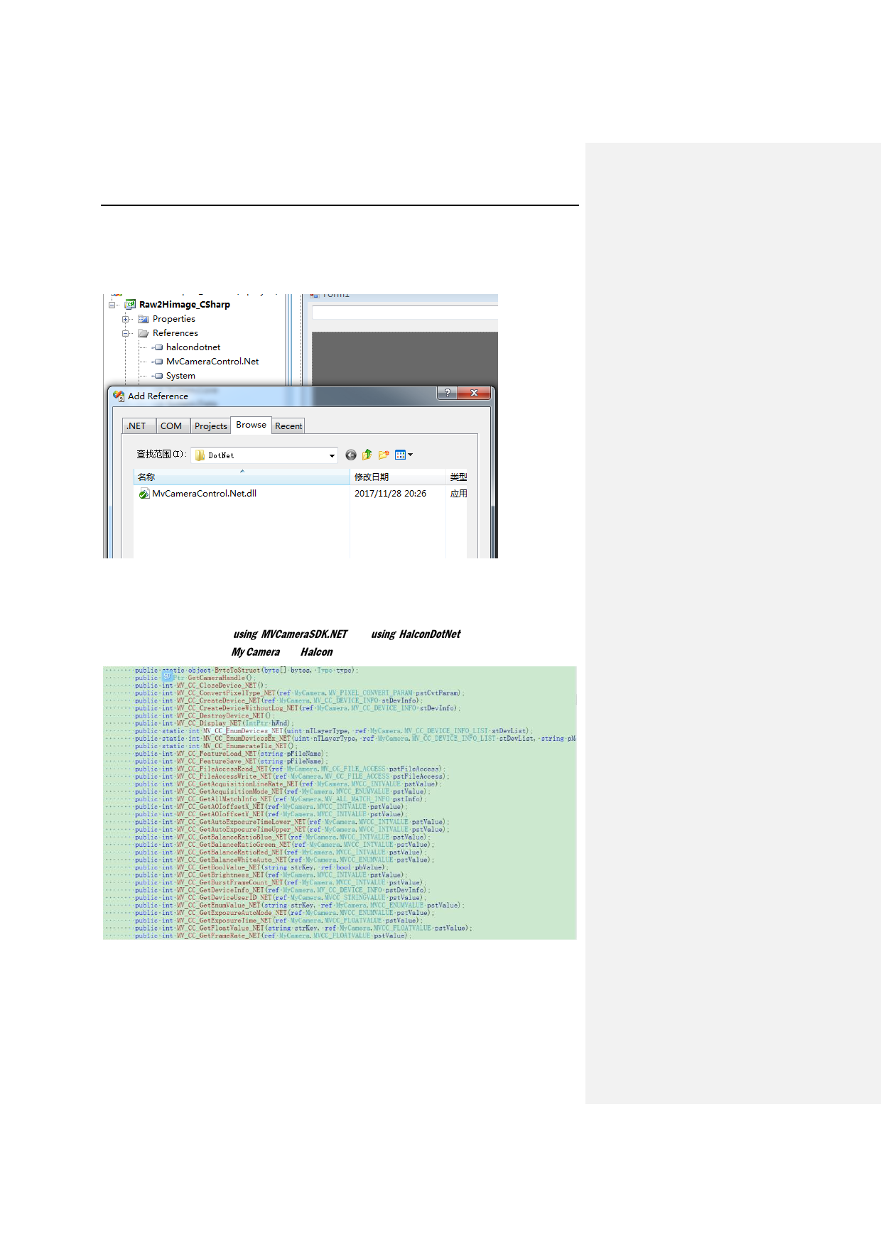 Referring the naming space using MVCameraSDK.NET and using HalconDotNet in the project to call the