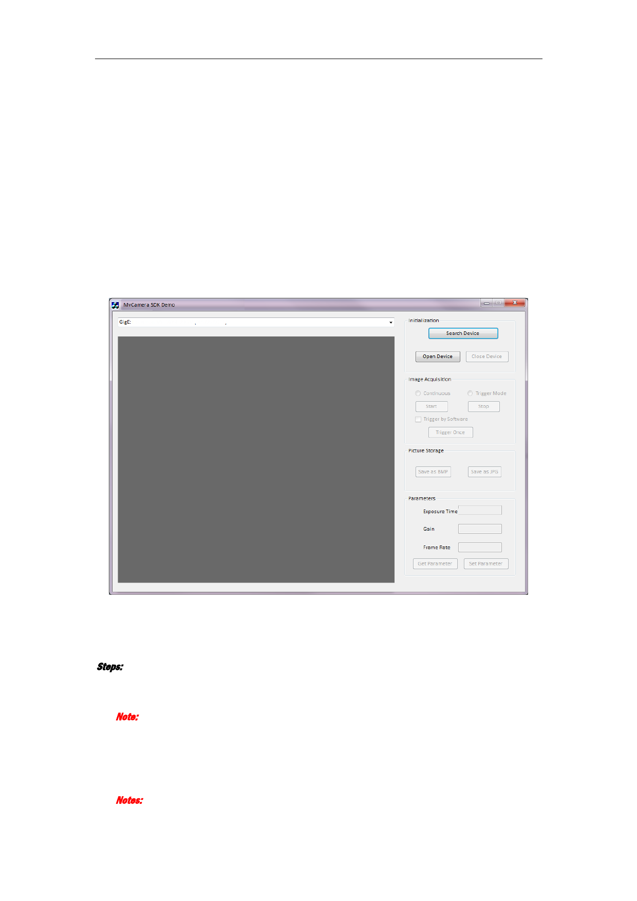 3. Click Open Device button in the Initialization field to active the Image Acquisition field.