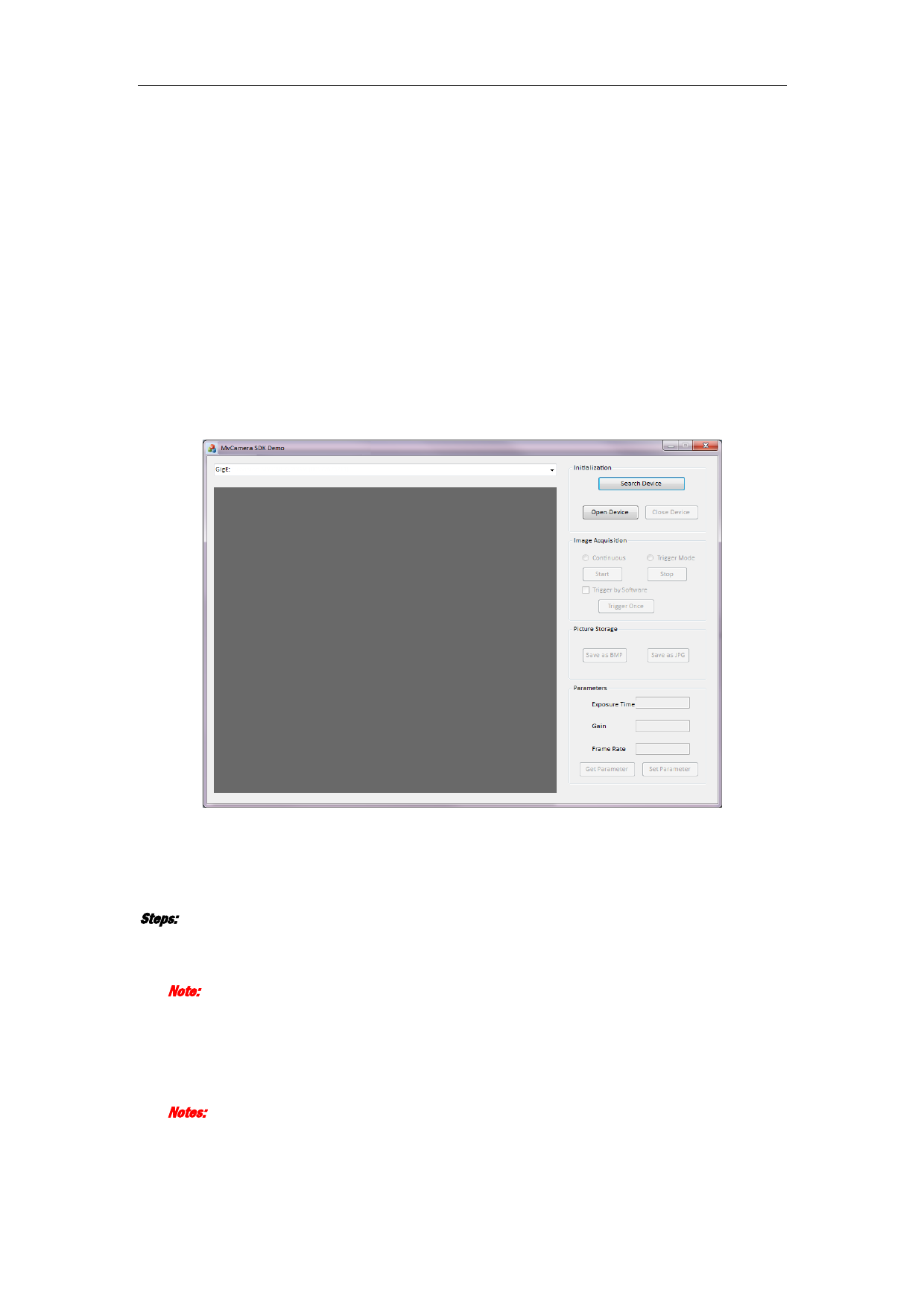 3. Click Open Device button in the Initialization field to active the Image Acquisition field.