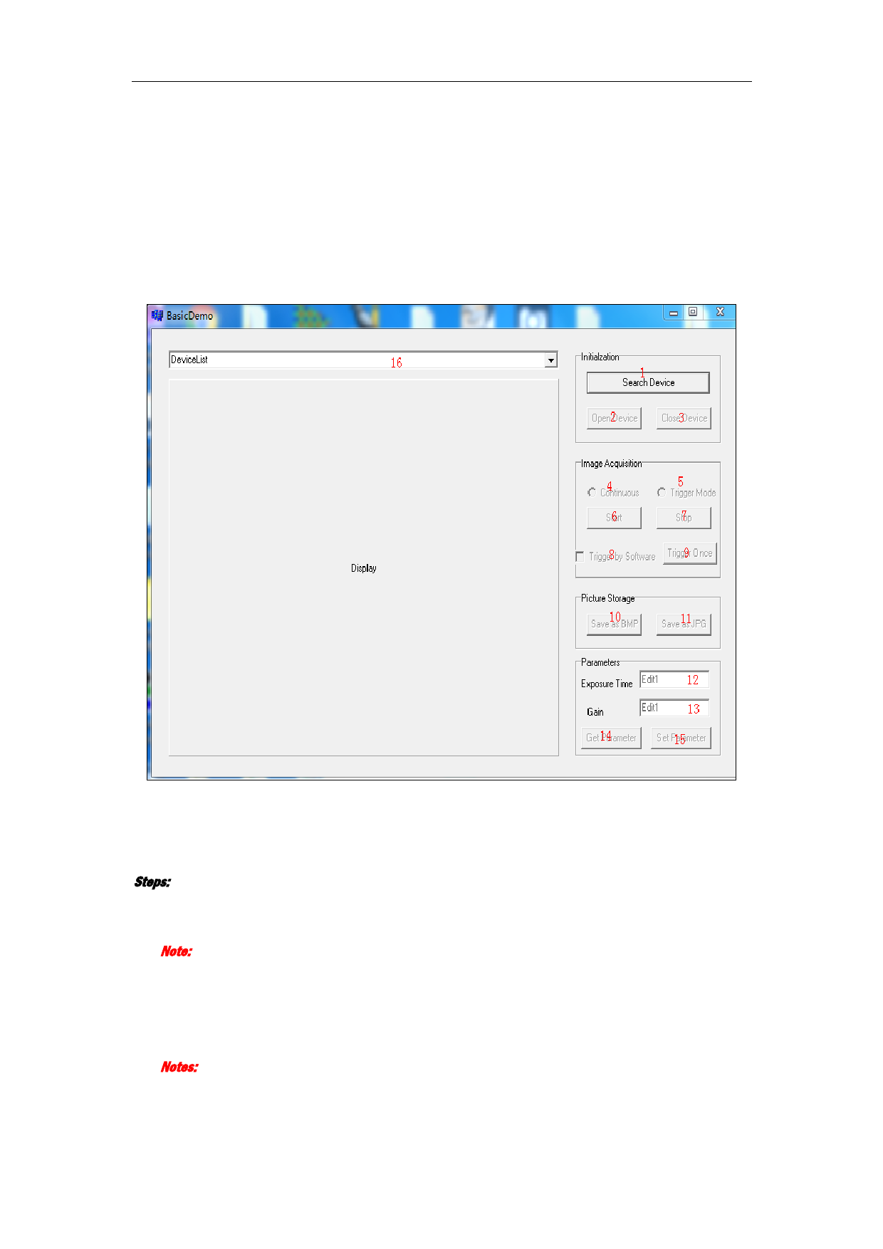 parameter control), one drop-down device list, one image displaying window.