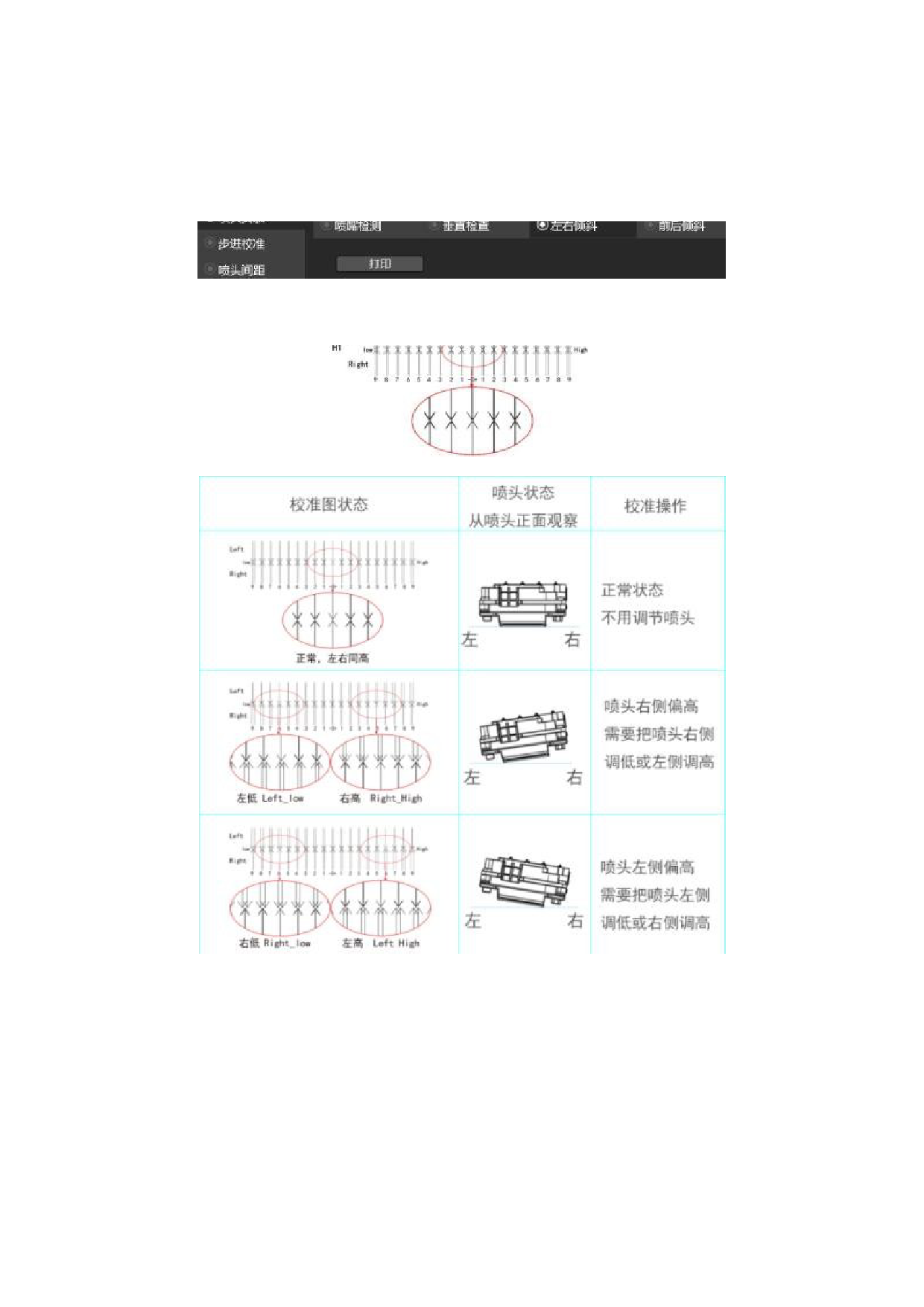 通过打印检测图用于当前喷头的左右高低位置是否不同;也可以通过不同 喷头的左右