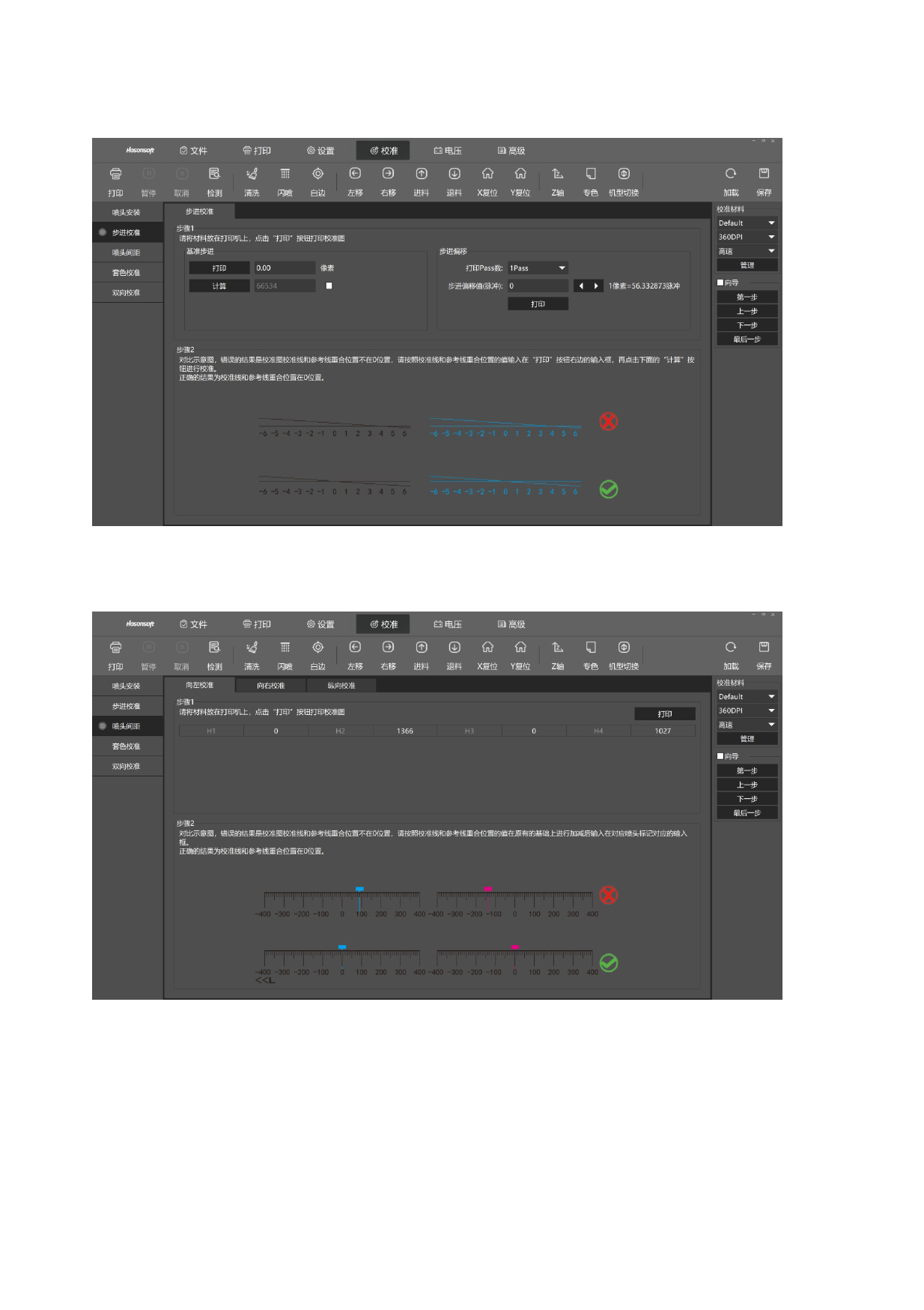 “用喷于头调空整间白”、彩、光油头的位置参数,保证喷头打印位置一致,不会错位。