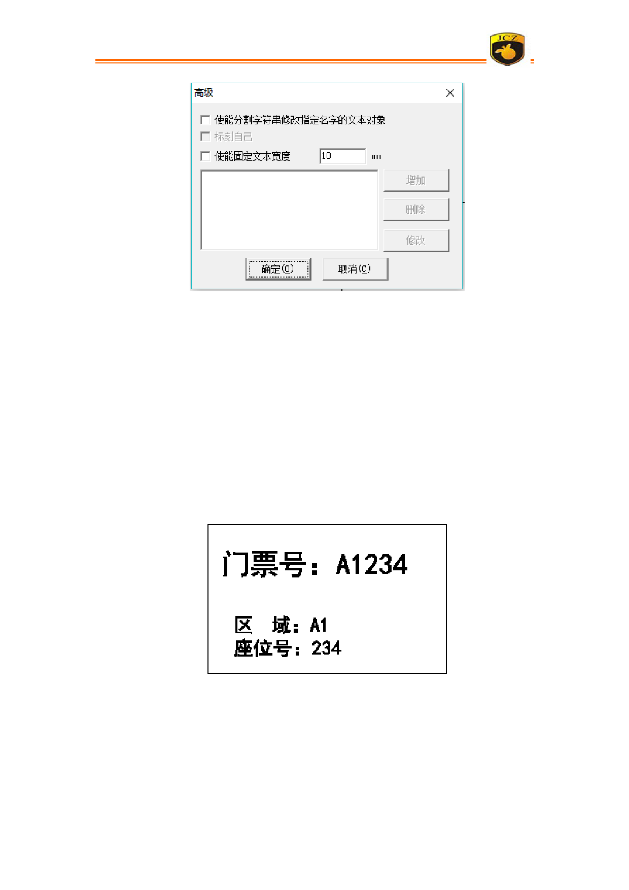 例:我们现在需要标刻一批门票,门票编号内包含区域、座位号信息,如下图。