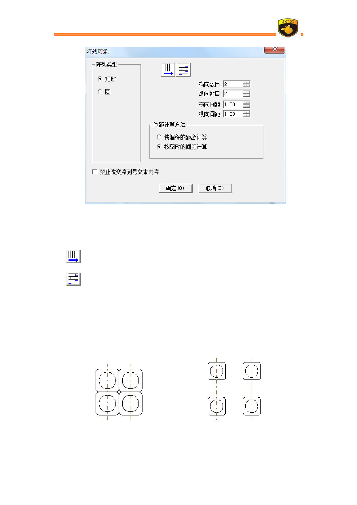纵向间距:阵列后 Y 向图形之间的距离。