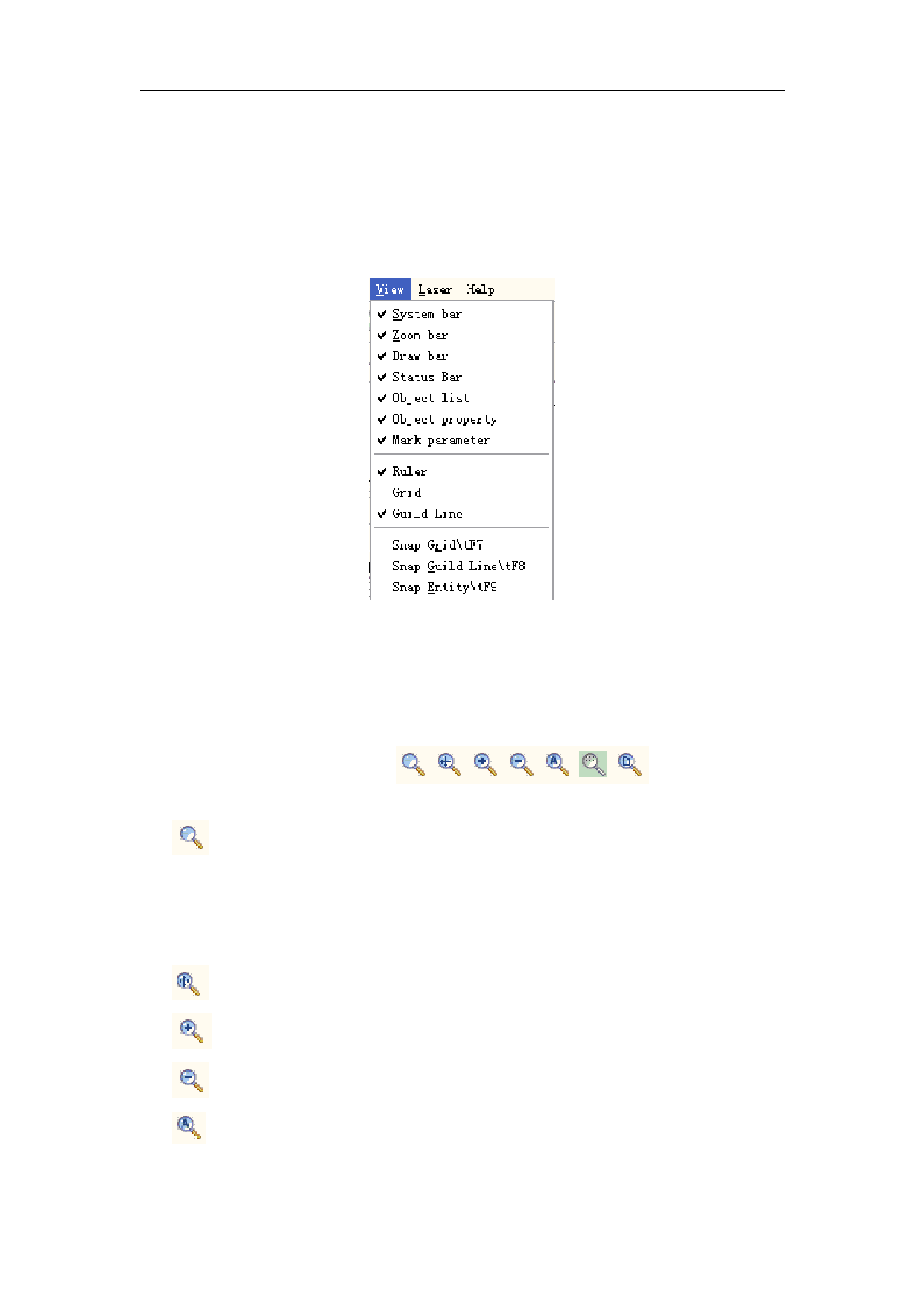 The View Menu is used to set every option for view in the EzCad2 window, as Figure 6-1