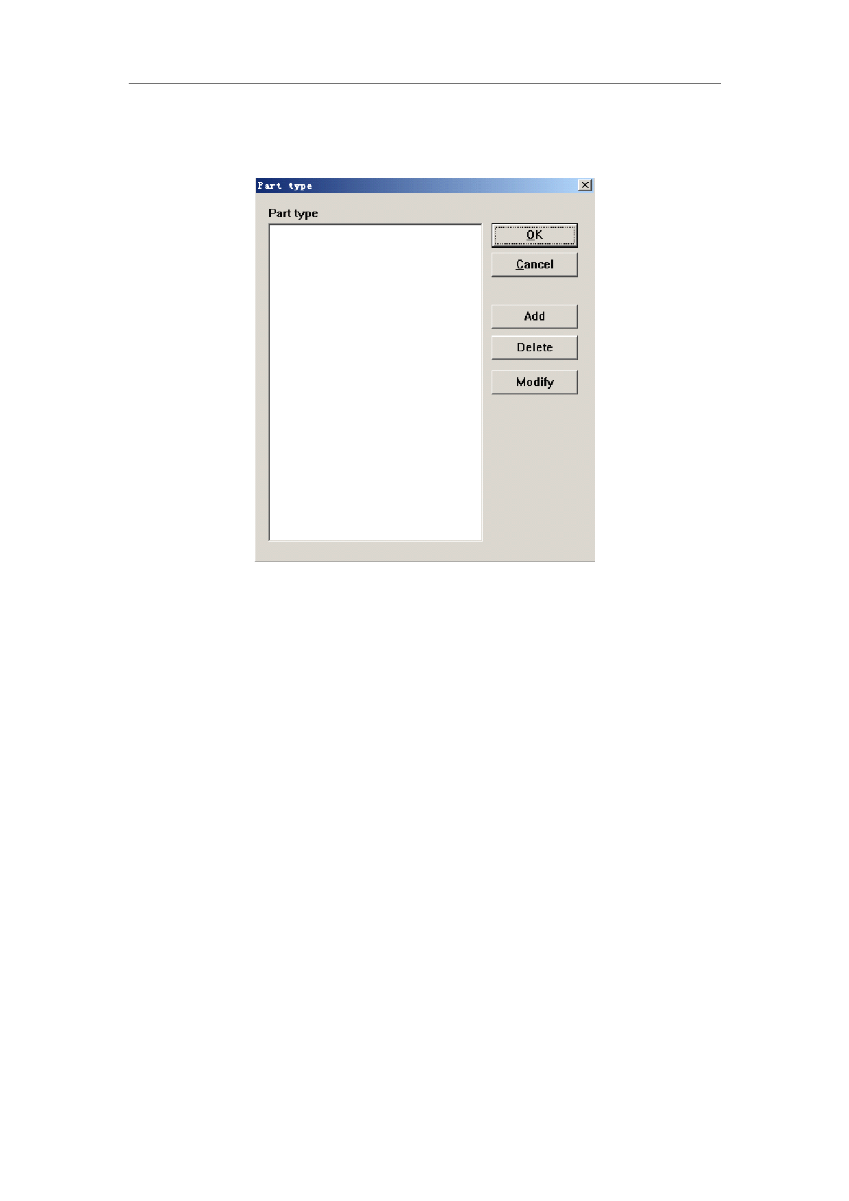 Firstly, click Add button to add a new part type. The dialog box in Figure 8-16 will popup.