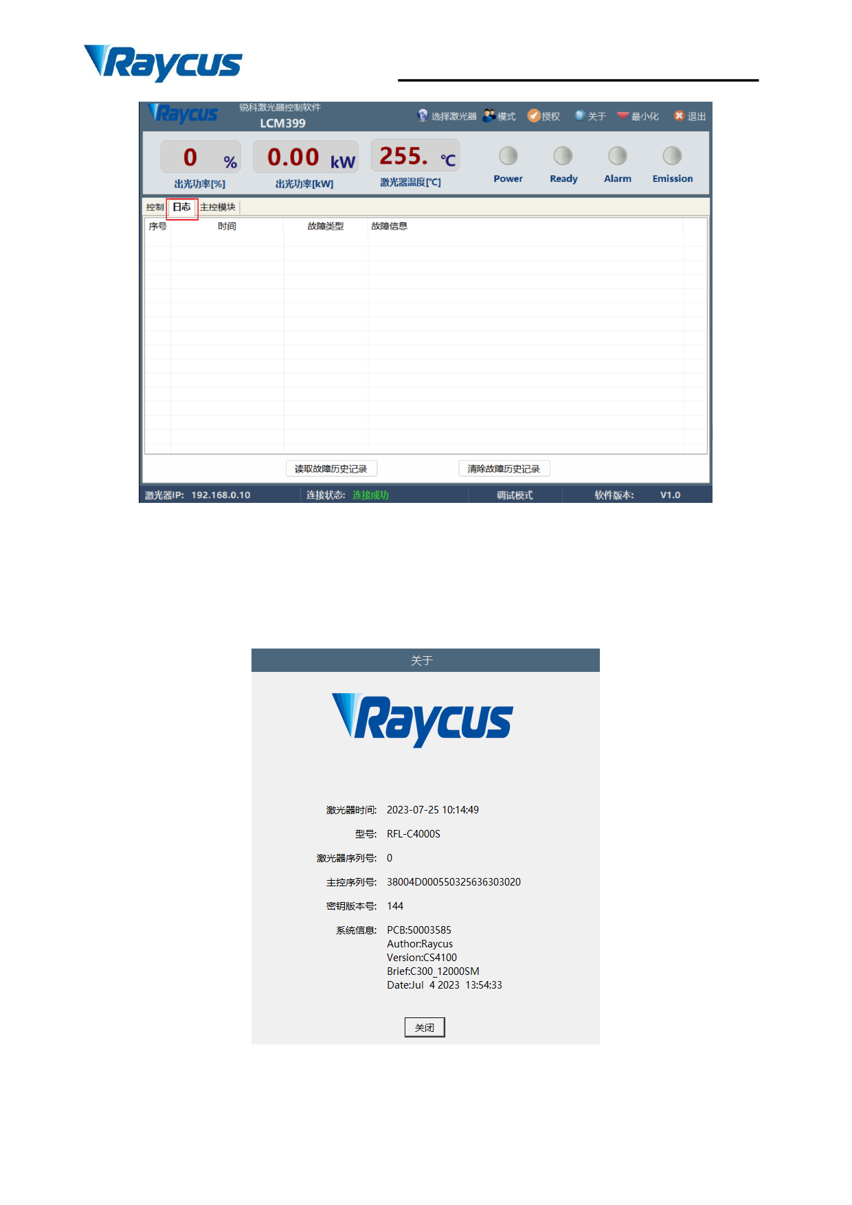 关于界面中显示了激光器时间、型号、序列号、主控序列号、密钥版本号和系统信息,