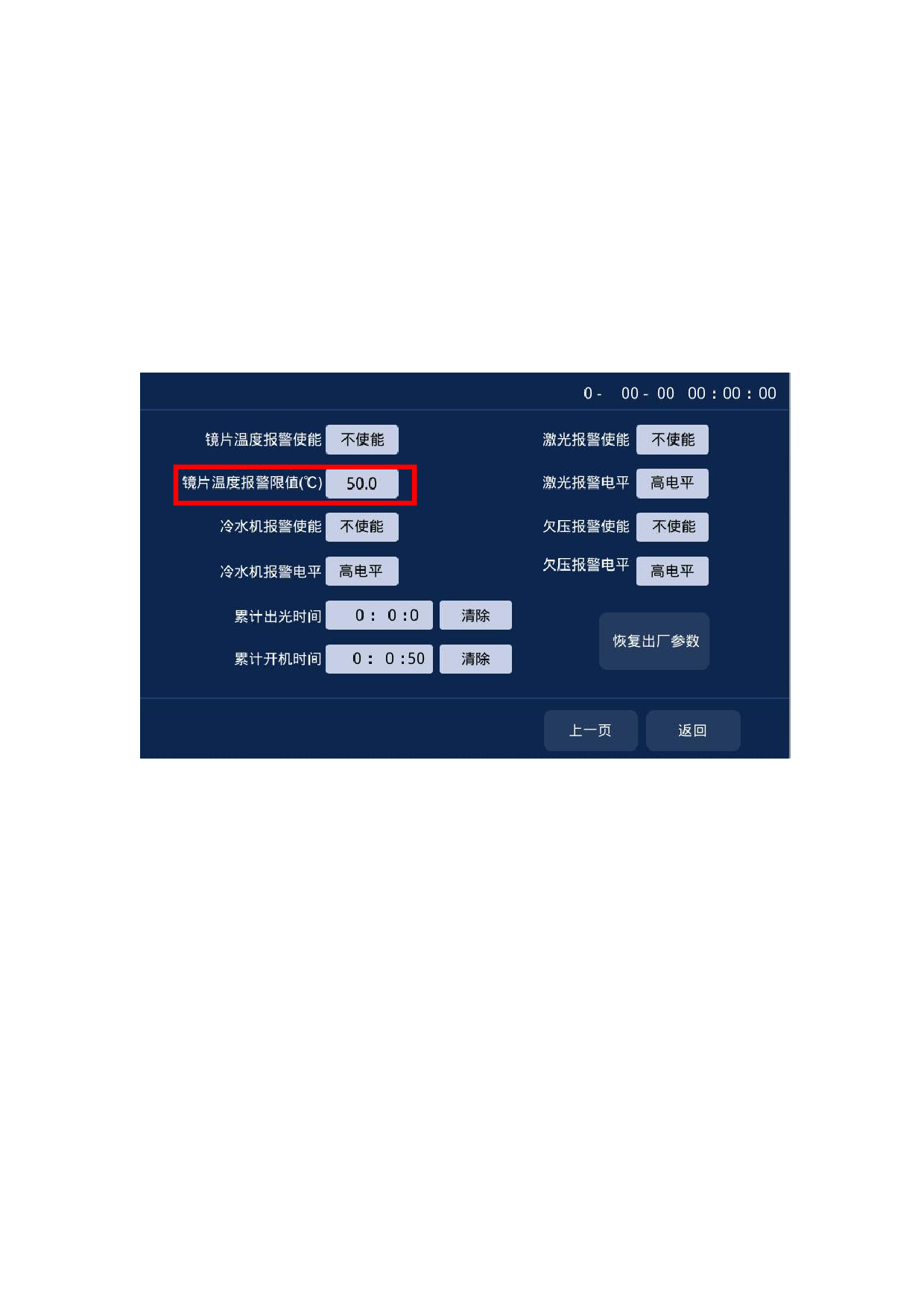 镜片温度设定值,建议设定为 50,当镜片温度超过设定值后,主页面出现报警