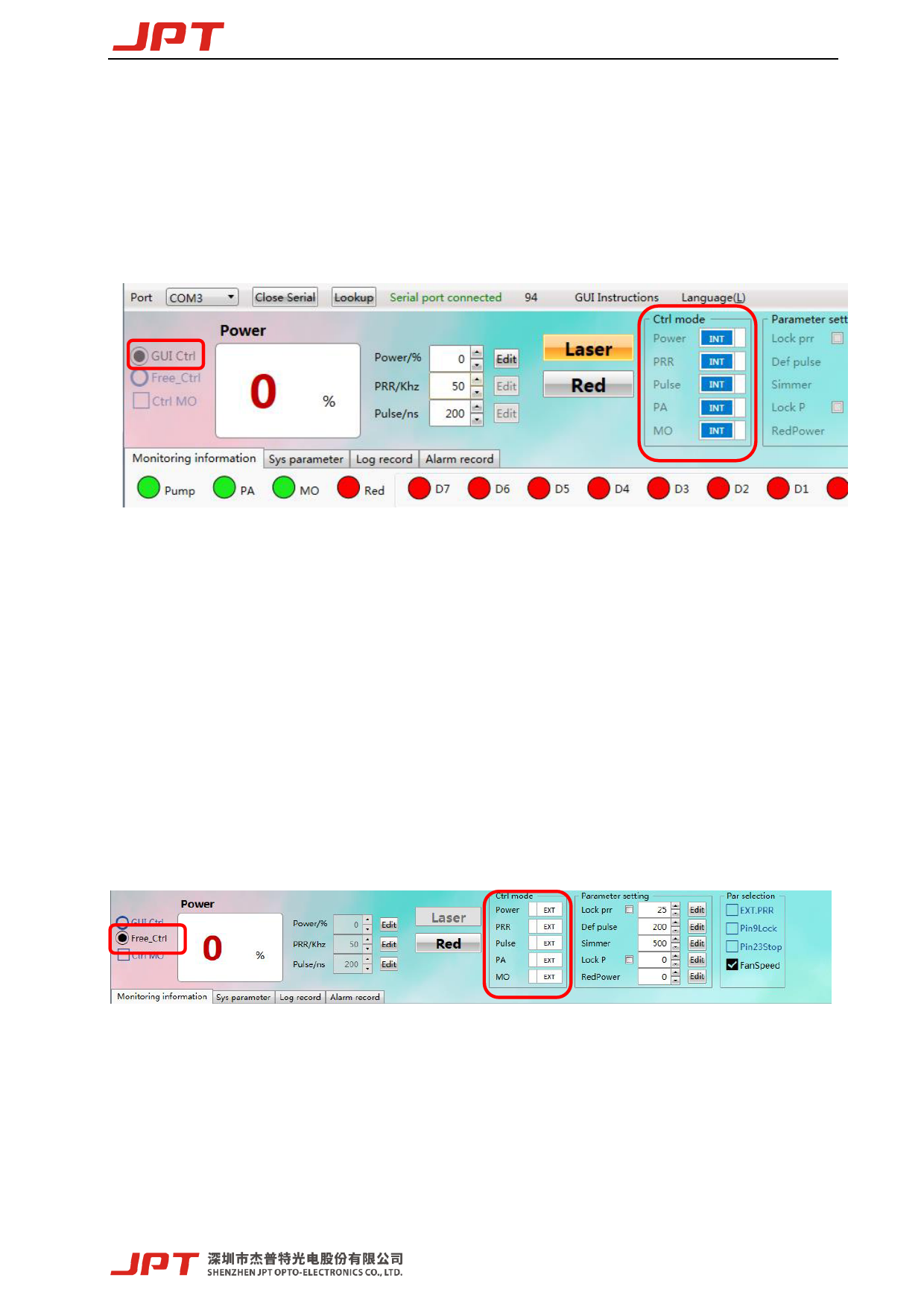 to “Free Ctrl” mode after serial port closed, and all the parameters of Internal/External Control
