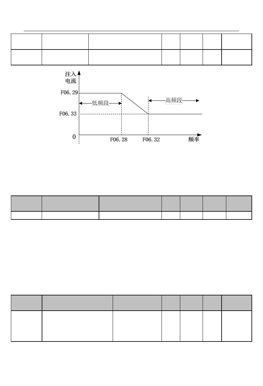 低频段时(输出频率<F06.28),注入电流大小由 F06.29 设定;高频段时(输