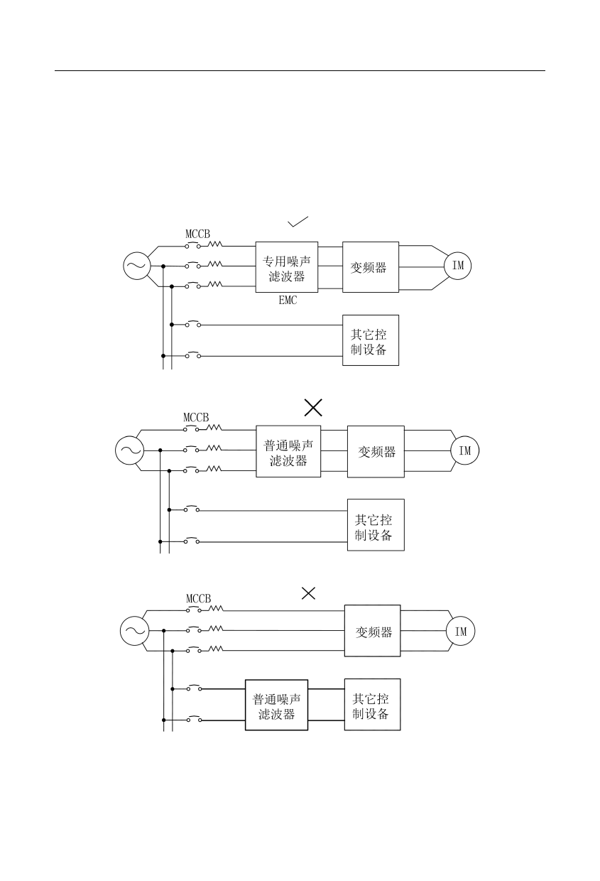 噪声滤波器的正确和错误安装方式如图 3-5 和图 3-6 所示。