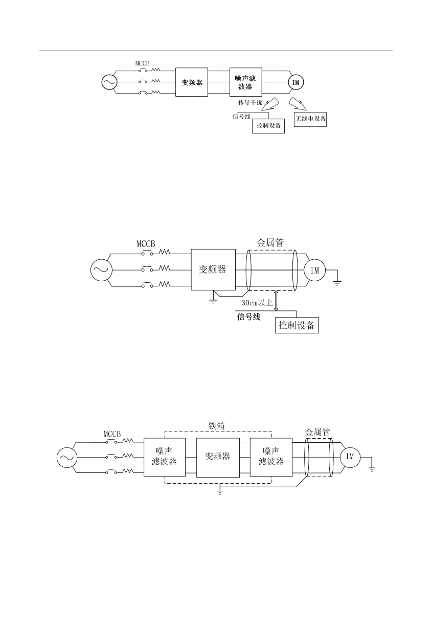 装噪声滤波器,并将变频器本体用铁箱屏蔽,则可降低射频干扰,如图 3-9 所示。