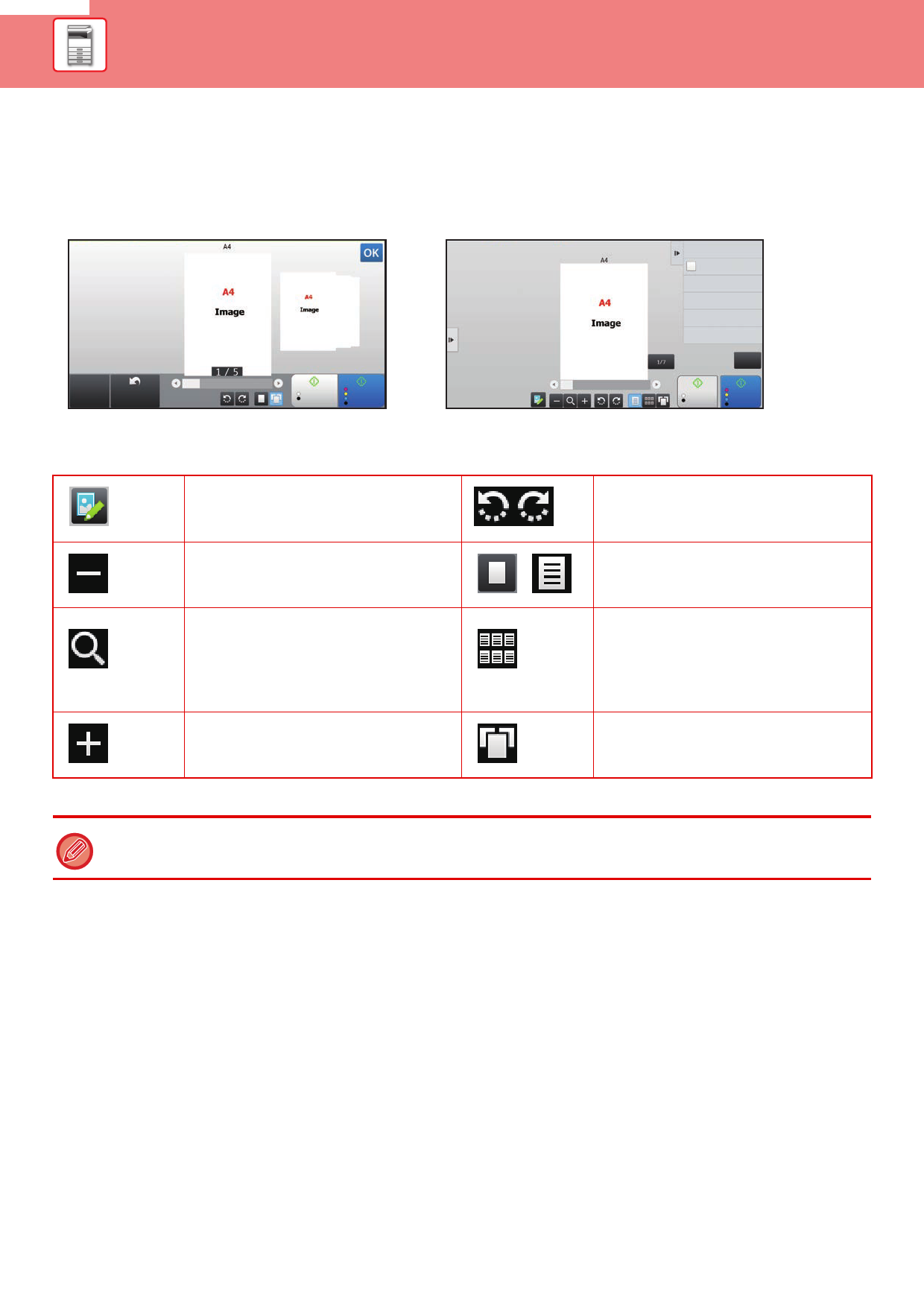 In the preview screen, you can view output images or images stored in the machine using the touch panel.