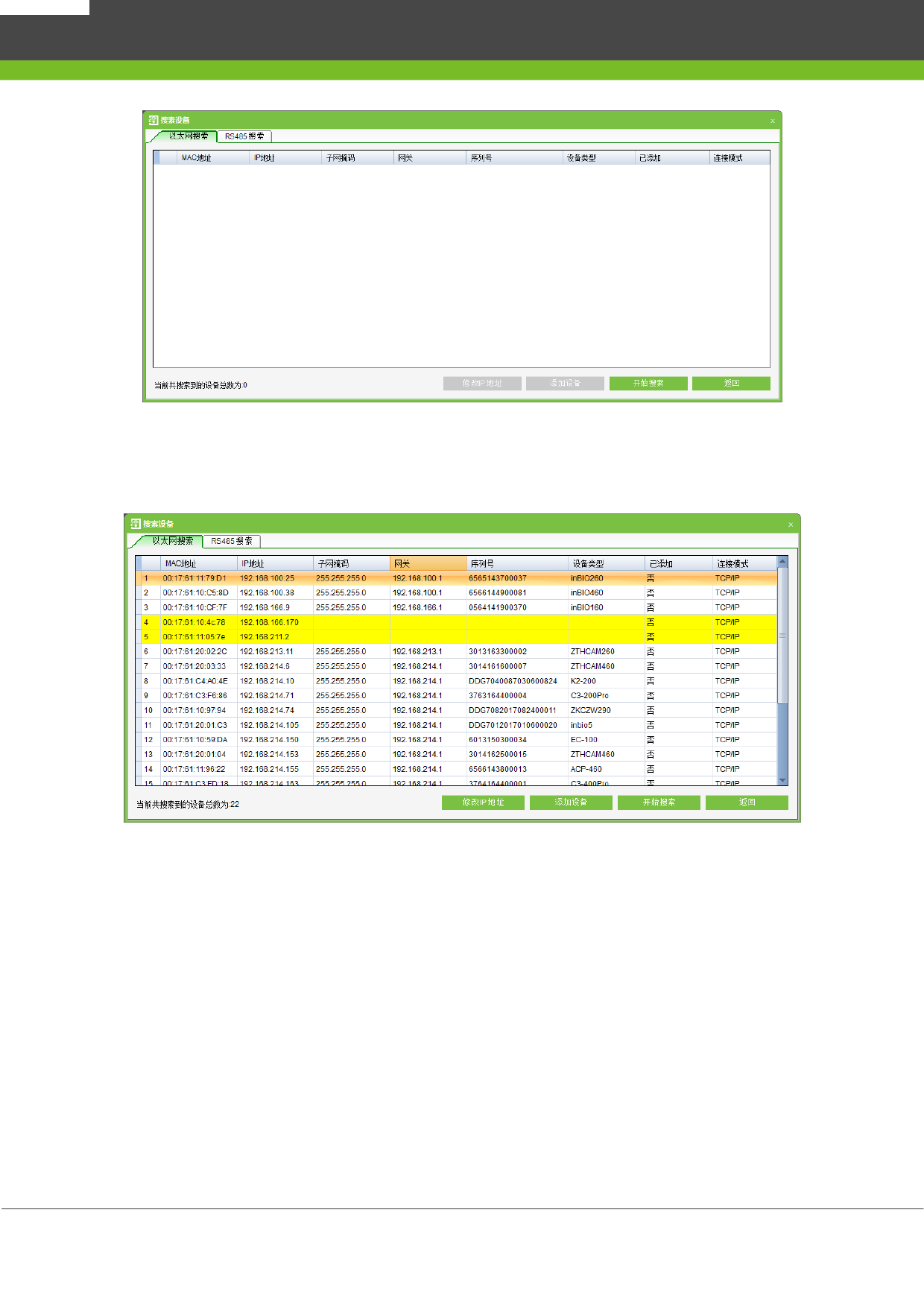 成后,显示门禁控制器列表和搜索到的设备总数,其中黄色背景为脱机设备。