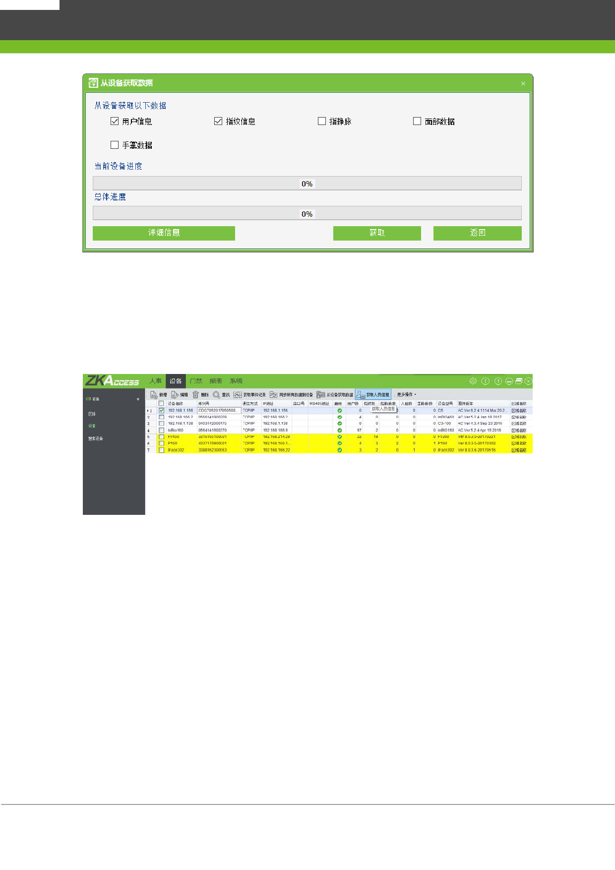 获取人员信息:重新获取设备中当前的人员数量、人脸数据、总的指纹数和指静脉数。获取到的