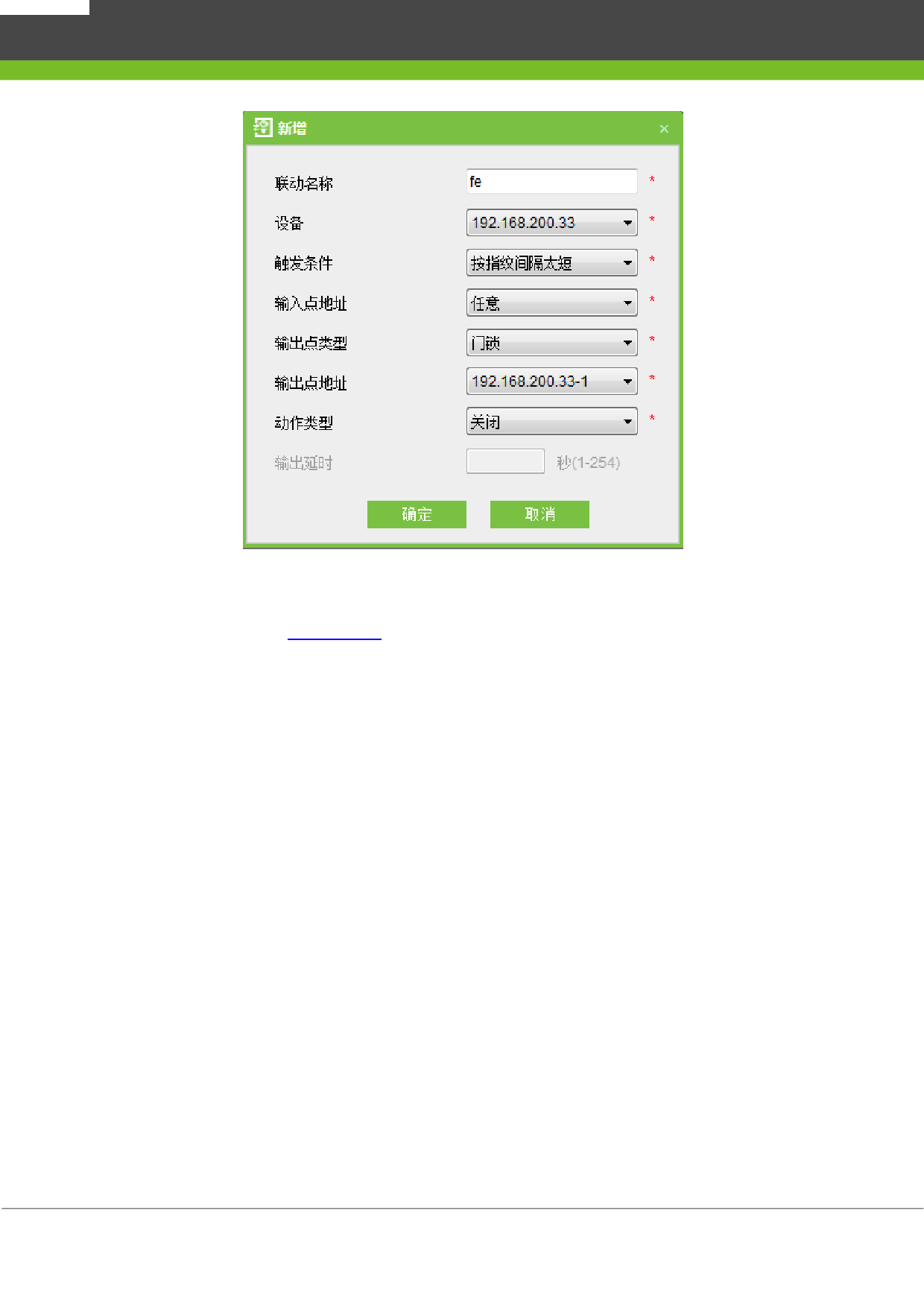 例如:触发条件选择“正常刷卡开门”,输入点:门 1,输出点:门锁 1,动作类型:打开,延