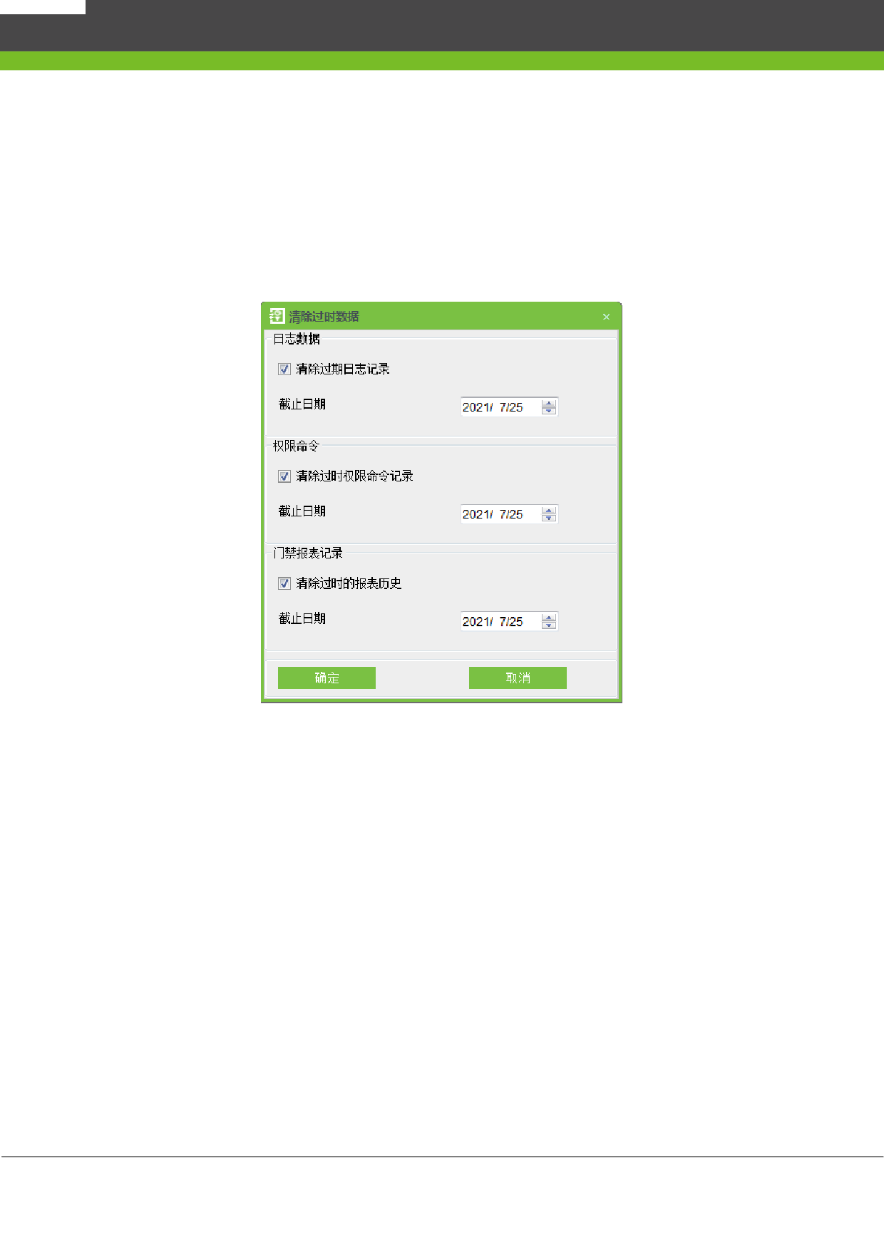 清除数据库中的过时数据,包括日志记录、权限命令和门禁报表记录。