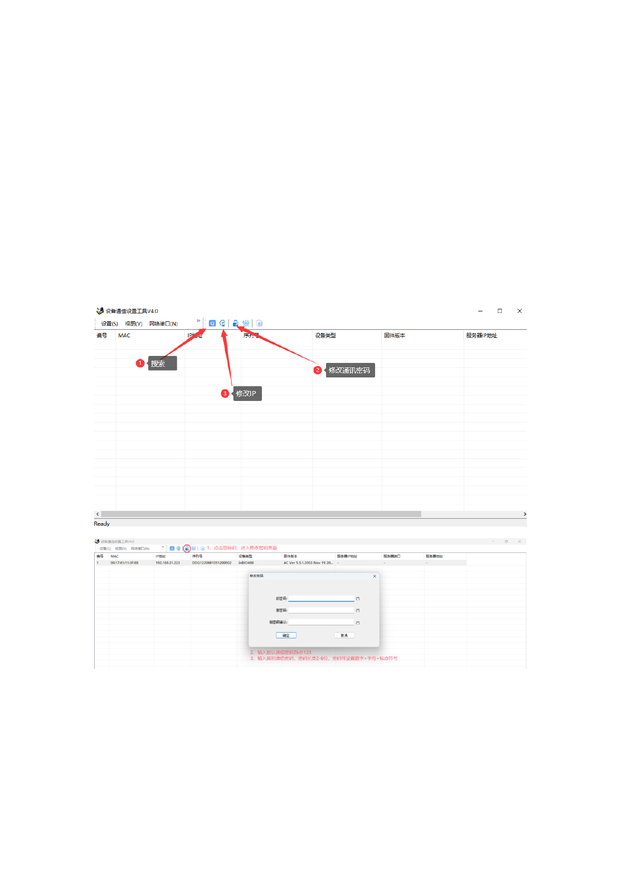 1、使用 DeviceSettingTool_V4.0-20250109 修改默认设备通讯参数及通讯密码,