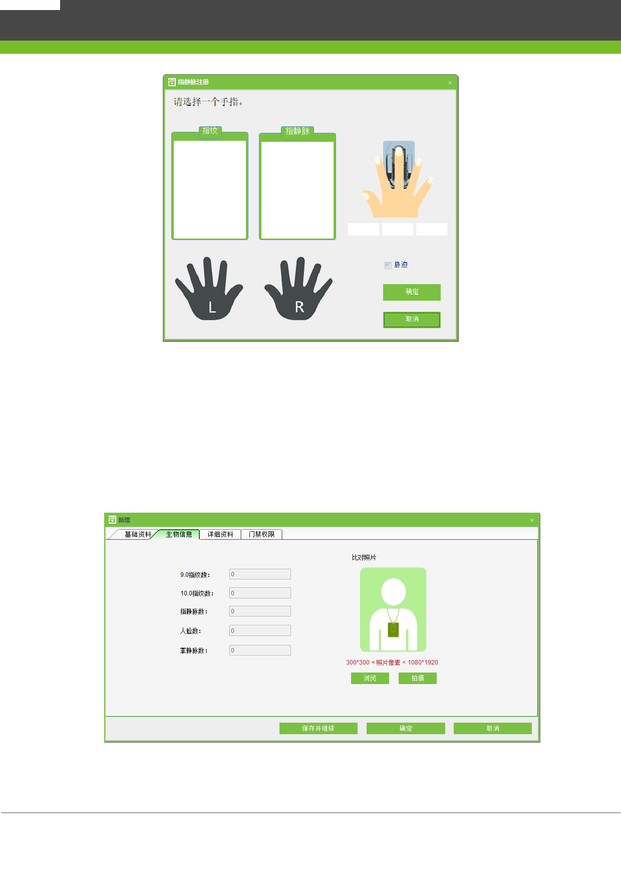 生物信息界面:可查看登记的指纹数、指静脉数、人脸数、掌静脉数,以及登记人员比对照片。