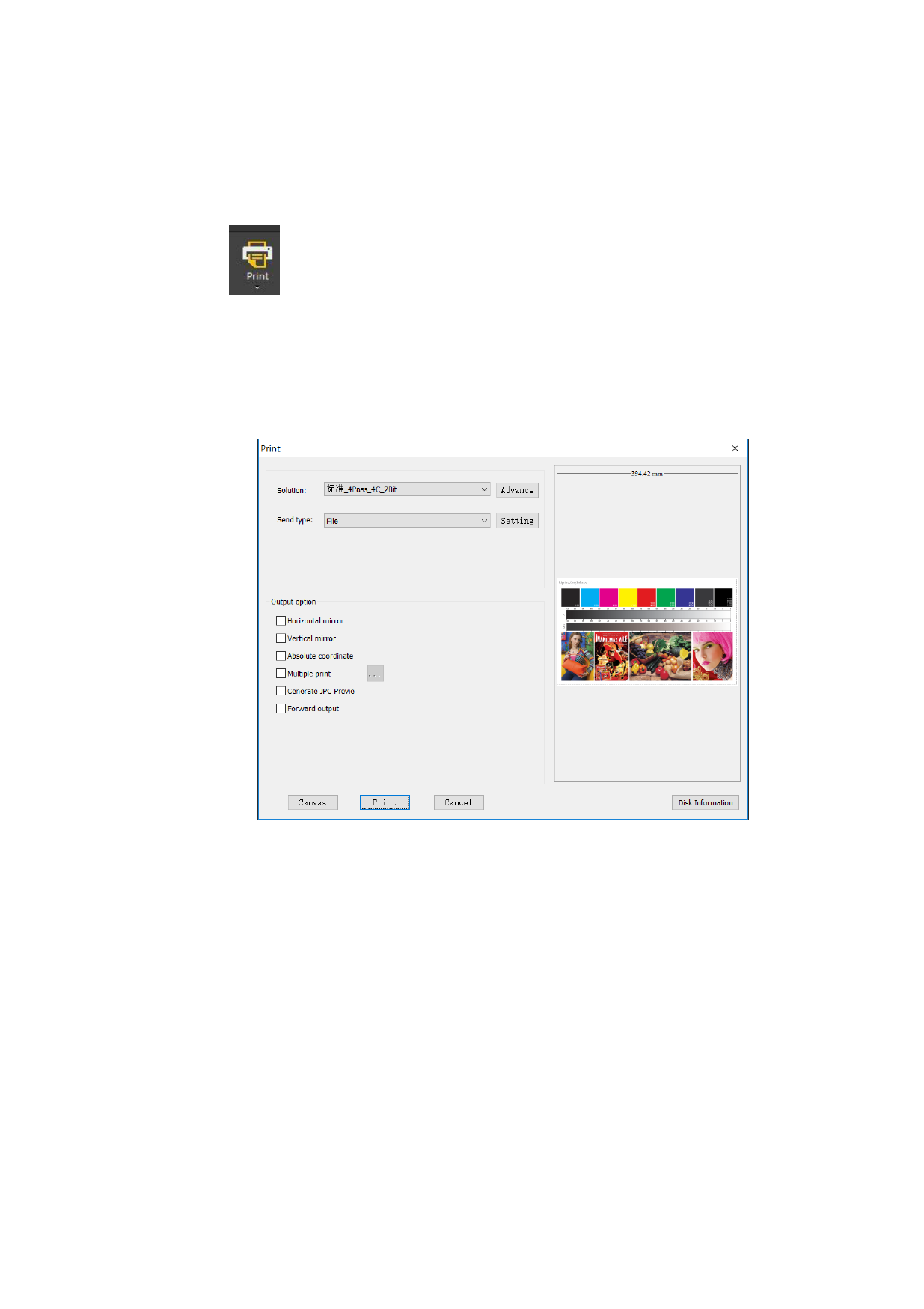After you complete a canvas (after the type-setting), you can print it. The method: Click the