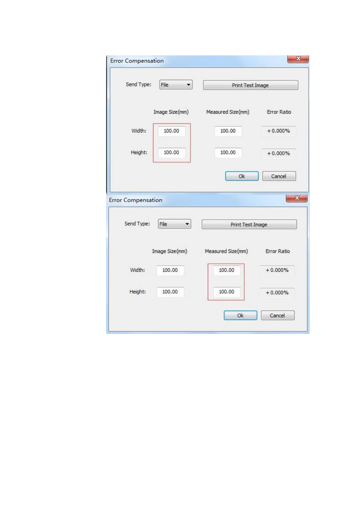 (3) Measure the actual printed image size, input it to the position indicating the print