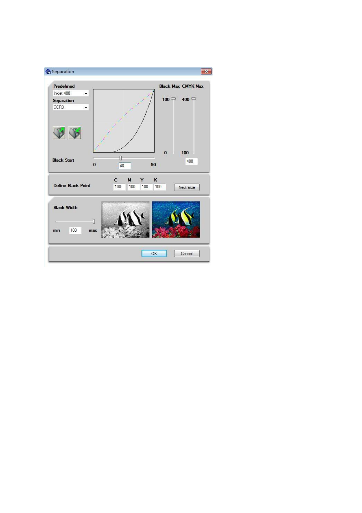 Separation button to set CMYK, which is generally set as CMYK Max and Black Start.