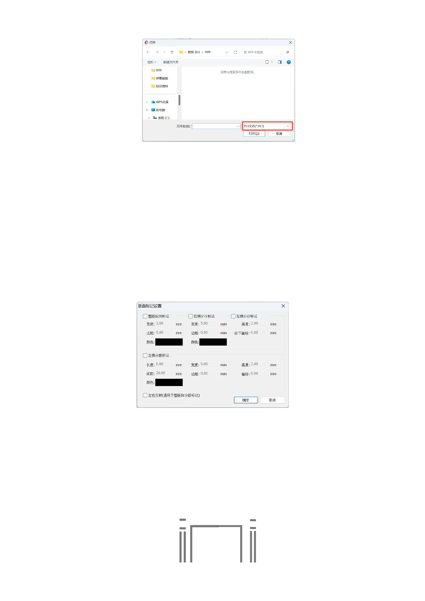 3)分版标记:打印的素材分版面进行排版,裁切机器识别版面标记进行切断。分版标记中偏移参数的数据范围从负的
