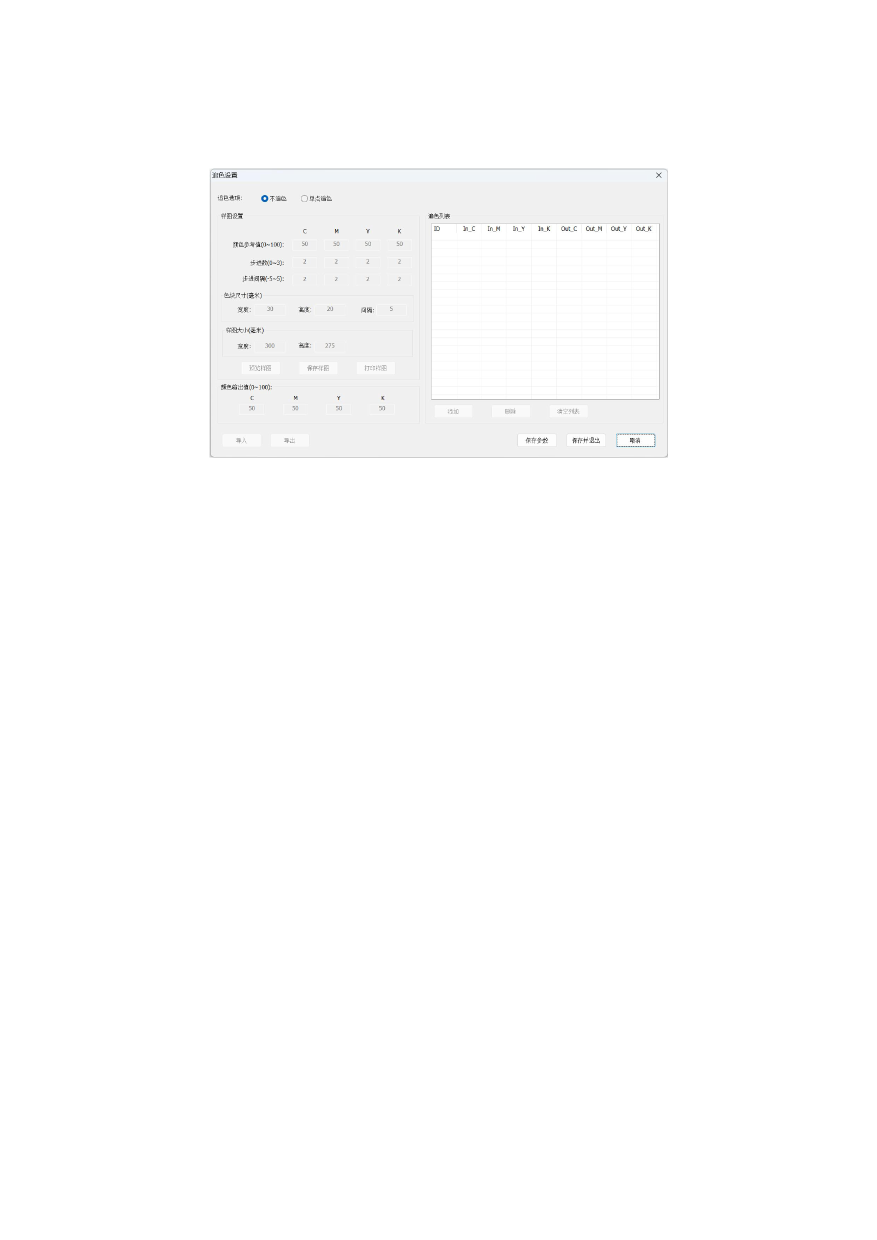 色块尺寸的默认值是宽度(30 毫米)、高度(20 毫米)、间隔(5 毫米)。宽度和高度可根据需要在 1 到 100 的