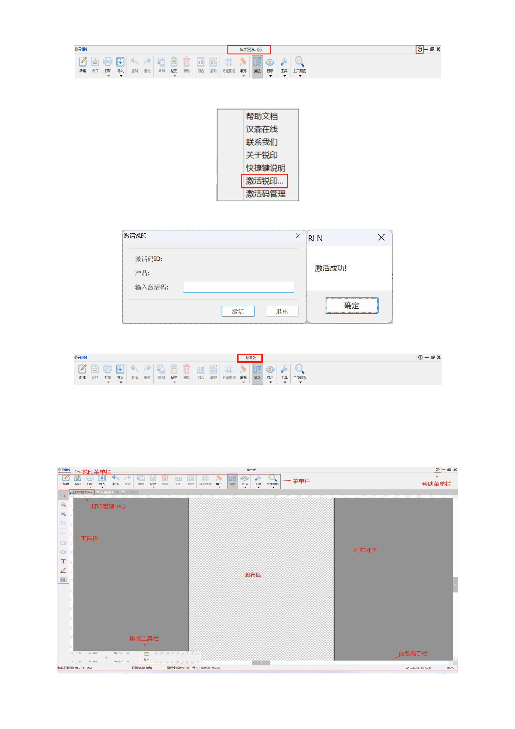 RIIN 的界面共分为十个功能区域,分别是:菜单栏、工具栏、锐印菜单栏,帮助菜单栏、打印管理中心、画布区、画布
