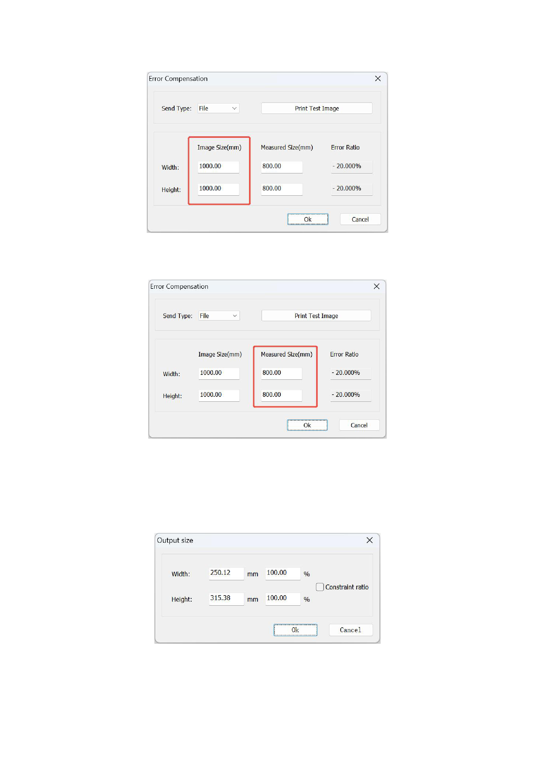 Measure the actual printed image size, enter it into the position shown by the printed measurement size, and click OK to