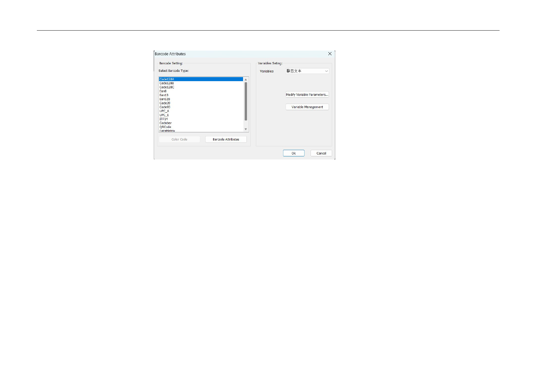 (1) suporta atualmente 15 tipos de códigos de barras, respetivamente, Code128A, Code128B, Code128C, Ean8, Ean13, Ean128, Code39, Code93,