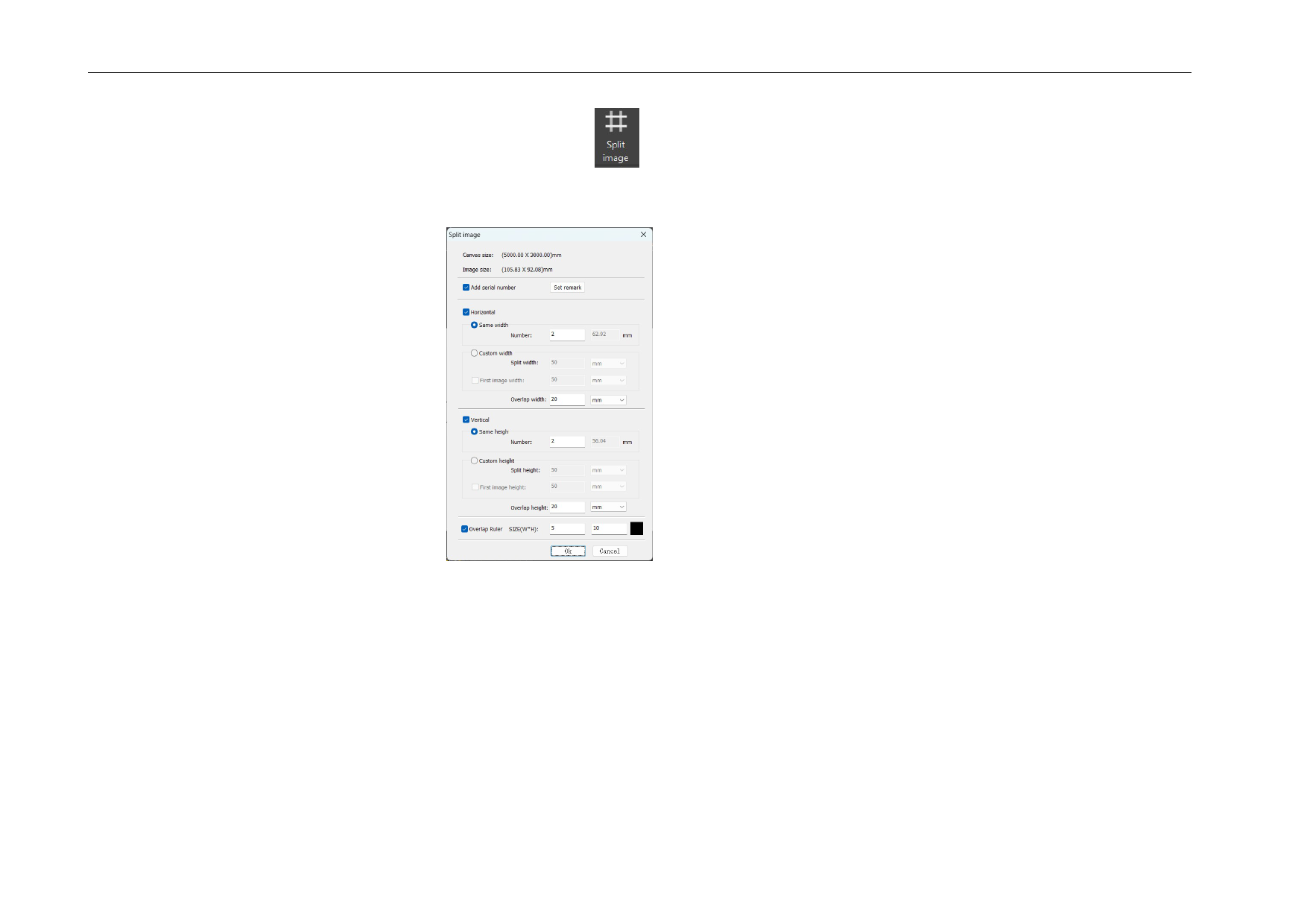 horizontal da tela (predefinição: 2 cm), e a largura de sobreposição predefinida é de 2 cm. Pode especificar a largura do