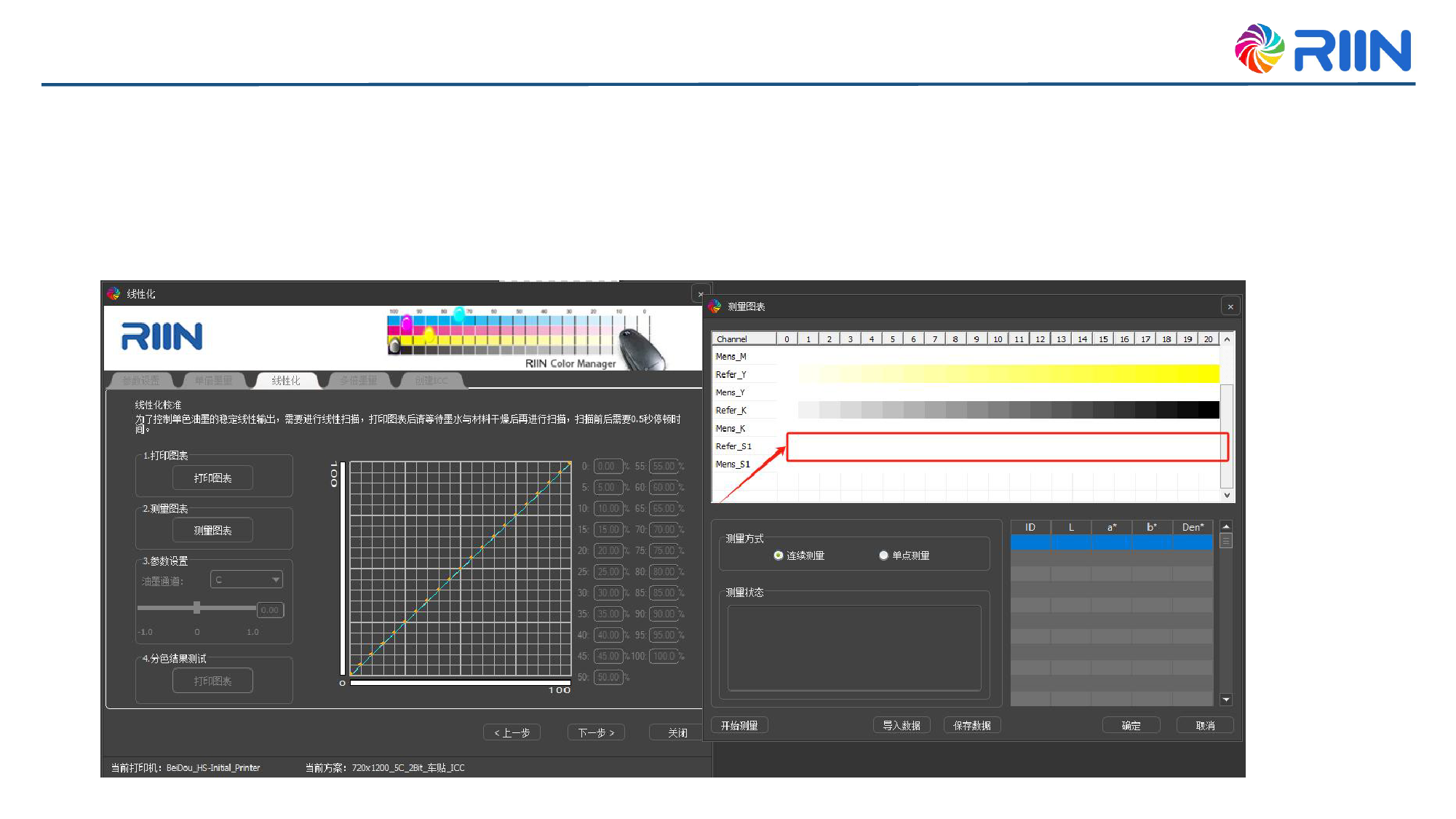 单色截墨后,打印线性化图表(注:测试时专色默认为白色,实际以扫描的数据为主),根据扫描数据